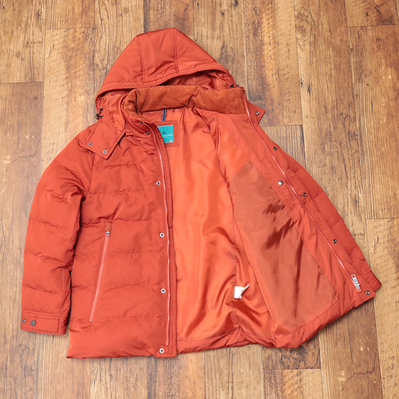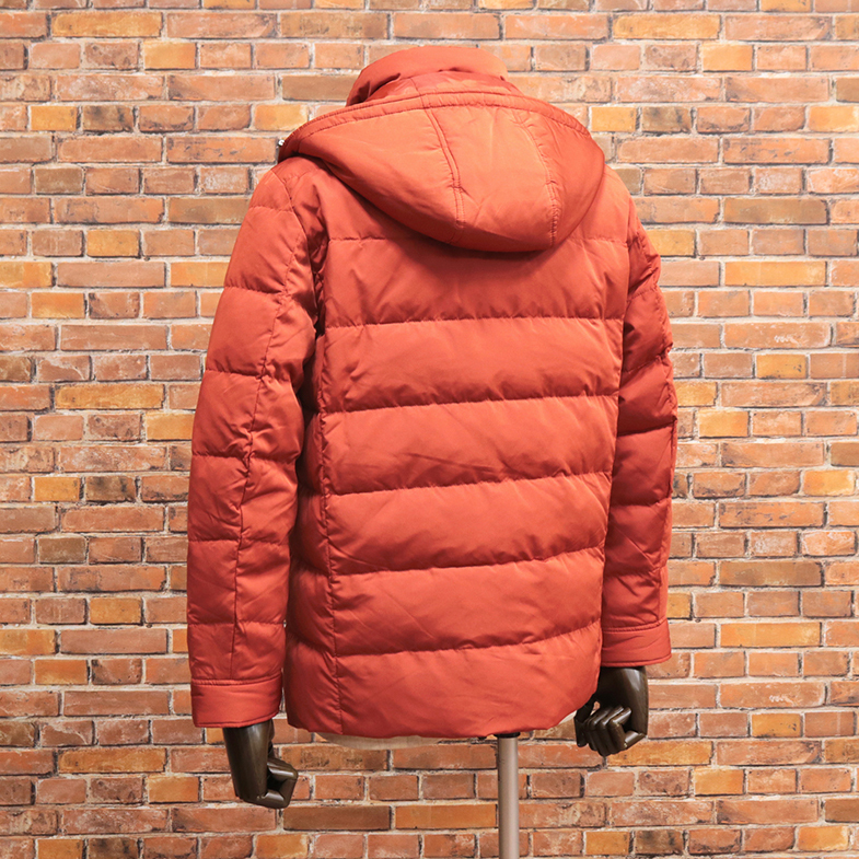 シングルジップ&6スナップボタンの二重構造、フード取り外し可能、袖口アジャストボタン、内側ダウン&フェザー入りの総裏地