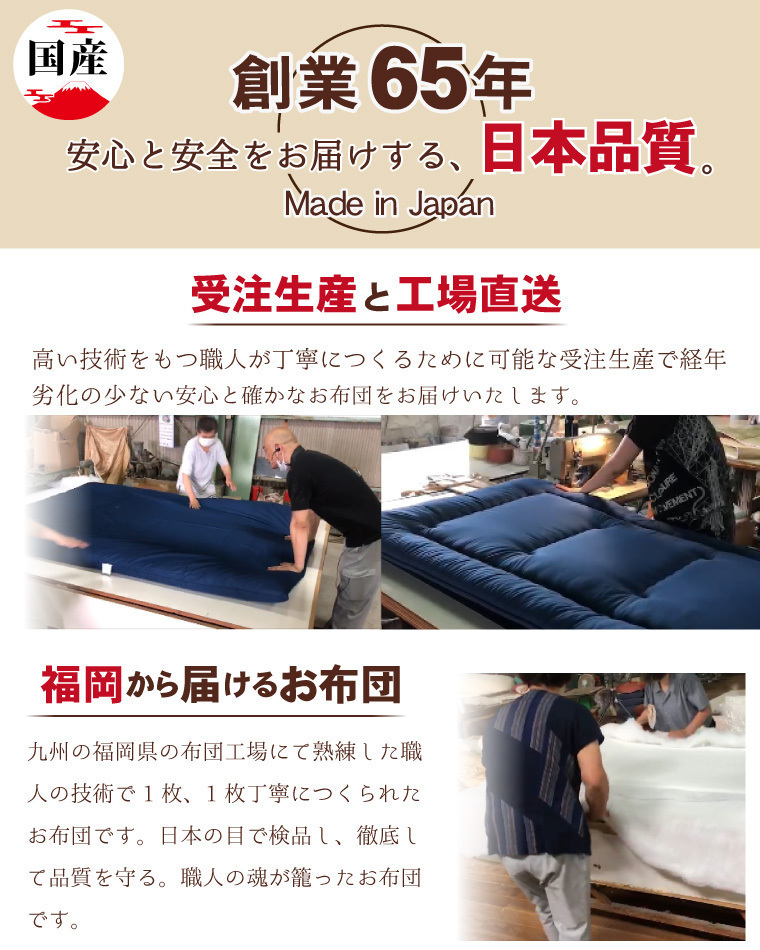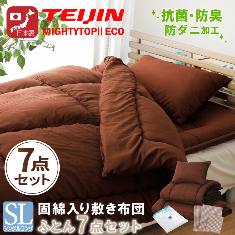 ・抗菌・防臭・防ダニわたを使用したこだわりたっぷりのシングルサイズ国産布団セット(掛け・敷き・枕)です。収納用の圧縮袋付きです。ピーチスキン生地使用で肌触りがとってもなめらか。 ・テイジン製の抗菌・防臭・防ダニわた「マイティトップII ECO」を使用。様々な試験で安全性も確認されており、エコ素材を使うことで環境にも配慮。生地の裏側には不織布も一緒に縫い合わせているため、中からわたが吹き出しにくく、とても快適にご使用いただけます。 ・注文をいただいてから国内工場で生産しているので、出来立ての布団をお届け。ご希望でサイズの変更を承ることもできます(別途費用がかかります) ・発送の際、圧縮してお届けしております。再利用できる圧縮袋を使用しているので、使わない際はコンパクトに収納も可能です。 ・創業65年続く国内の布団工場にて熟練の職人がひとつひとつ丁寧に手作り。国内メーカーの検針機にて2回の検針、2回の検品を行っているので、安心してご使用いただけます。この機会に是非お試しください! | |