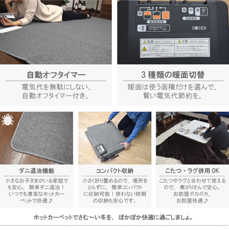 〇仕様 | ホットカーペット仕様:定格:交流 100V 720W、電源コード:ビニルキャブタイヤコード(VCTFK)・ダニクリーン機能、スライド調節、コンパクト収納 自動オフタイマー付き、暖房面切り替え(3面)・室温センサー、省エネモード、保証書付き |