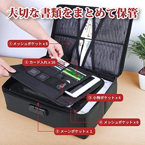 【驚きの使い勝手と収納力】シンプルなデザインながら、驚異の収納力を誇る耐火収納バッグです。B5サイズのノートやスマホを収納できるファスナーポケットに加え、メッシュポケットやカード入れ、小物ポケットなど多彩なポケットで、アイテムを種類別に整理できます。A4サイズの重要書類も楽々収納可能で、カード重視のレイアウトでは最大16枚のカードを収納できます。まるで小型家庭用耐火金庫のように、大切な書類や貴重品をしっかり守ります。