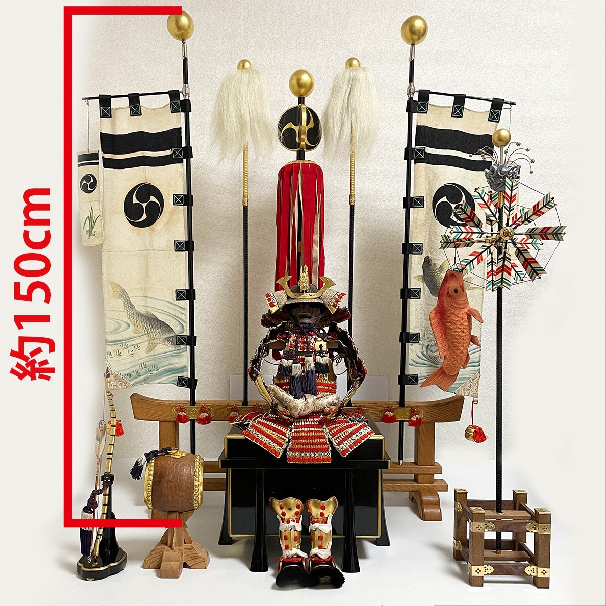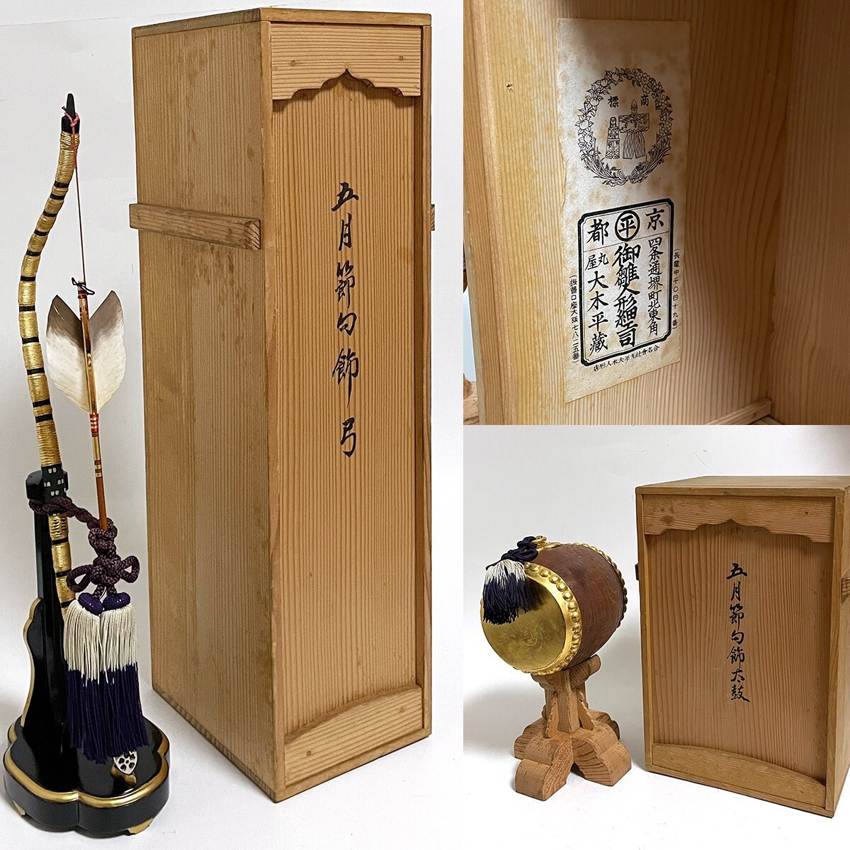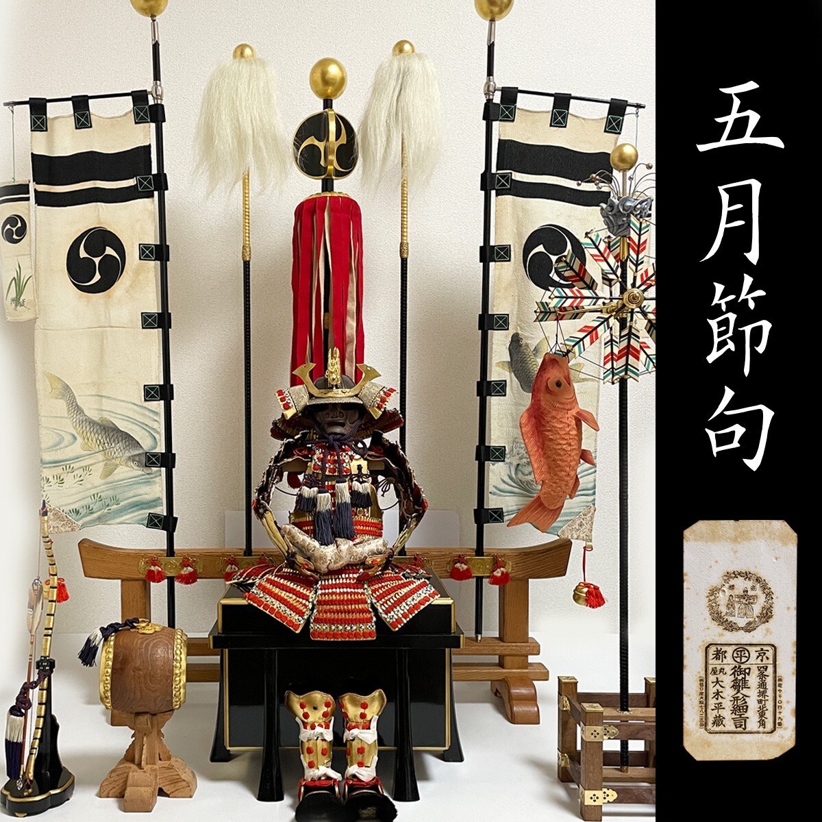 大正初期の丸平の五月節句飾です。※鯉幟は大正末期頃の商標です。 若干のシミ等はあるものの、100年前の品とは思えないほど良い状態で保管されています。 鎧だけでなく、座敷幟や弓太鼓、鯉幟まで揃っているのは大変貴重な品かと思います。 おそらくこれだけのセットがヤフオクに出品された事は過去10年でも 一度もなかったかと思いますので、この機会に是非入札ご検討ください。 品物はすべて丸平の札が貼られた共箱に収納されています。 当時の資料がなく細かい部分まで揃っているかの確認が難しく、 写真掲載の品が全てになりますので、ご理解の上写真をよくご覧になり ご入札をお願い致します。 |