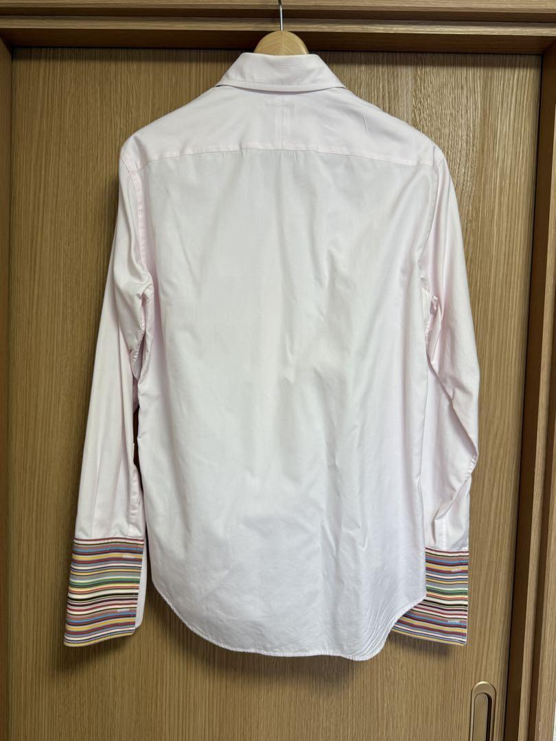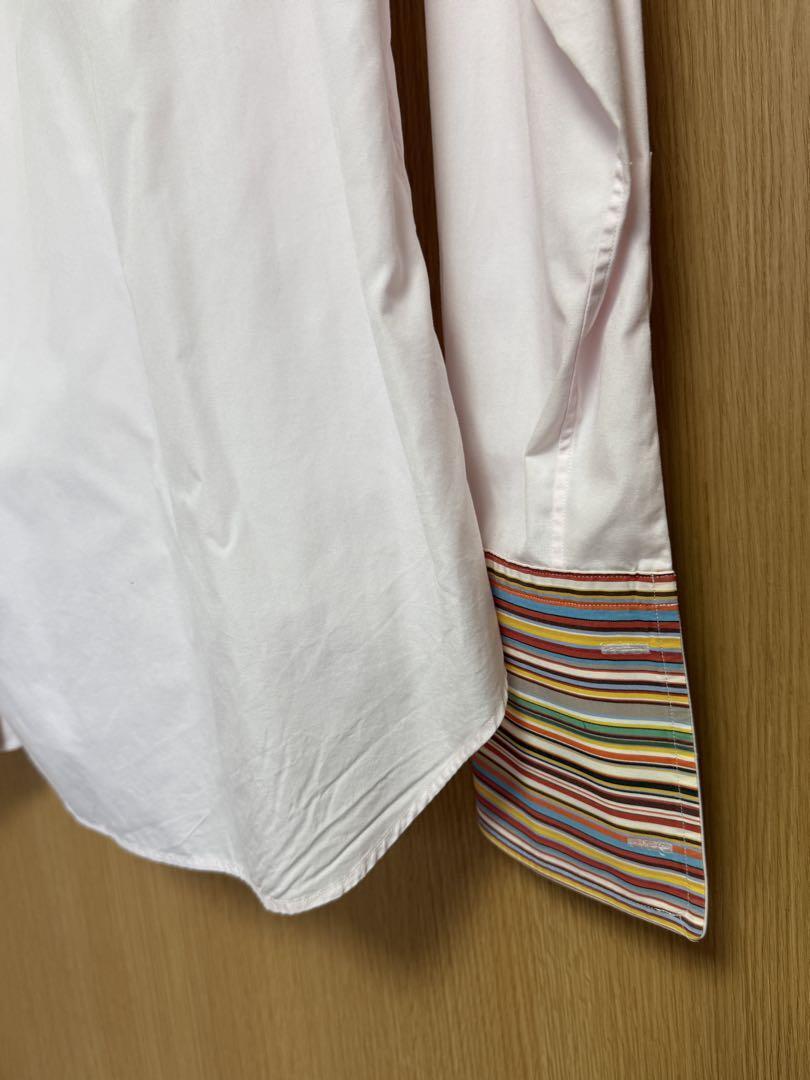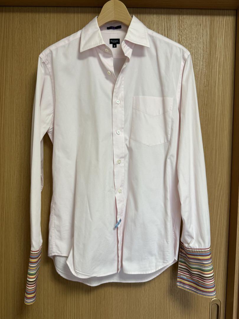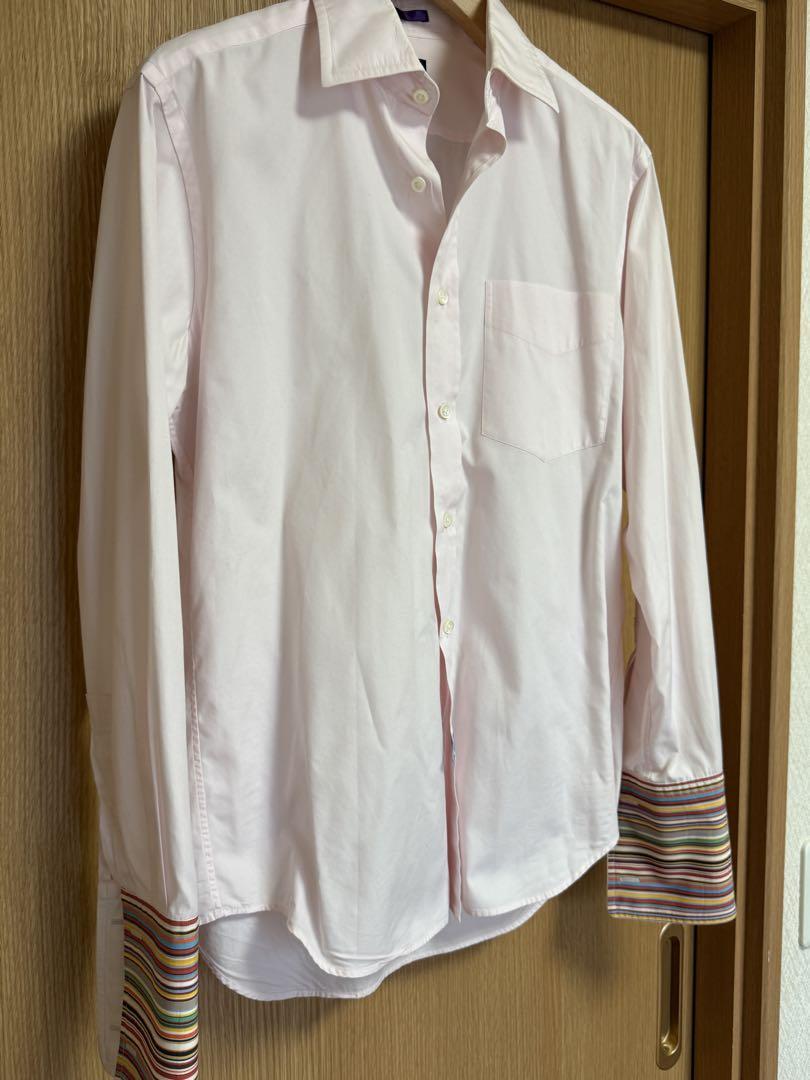 薄いピンクのシャツです。 袖口のマルチストライプが印象的です。