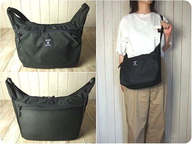 ・上品な光沢とハリのある両面撥水加工を施したポリエステルのツイル生地を使用したアネロ【anello】のショルダーバッグです。開閉はダブルファスナータイプで、前面と背面に大きめのファスナーポケットが1つずつ付いています。内側にはメッシュのオープンポケットも付いています。背面はクッション入りのメッシュ素材で、ショルダーストラップは幅2.5センチで長さは約64~123センチの間で調節が可能です。