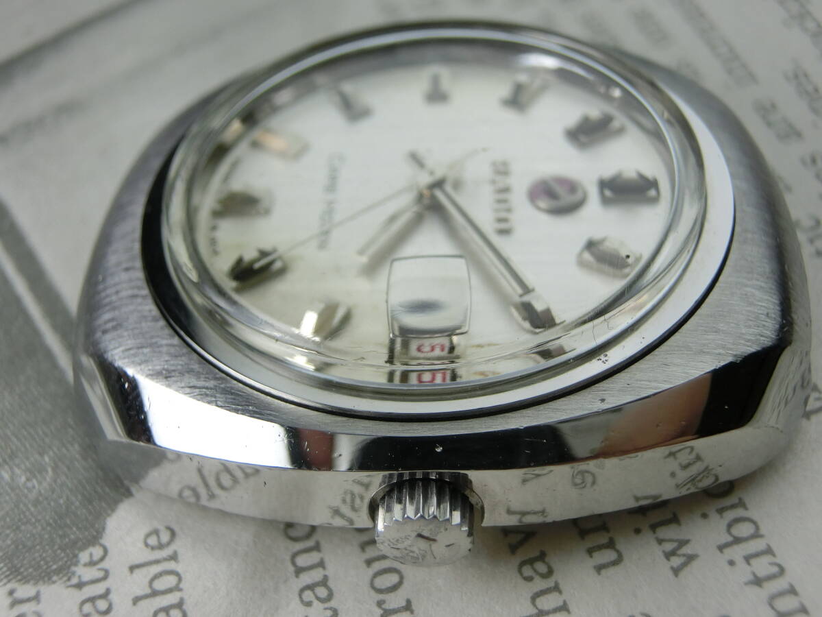 文字盤の傷みがちょっと目立ちます。プラ風防は斜めから見ると細かいクラックが多数見られます。ケースの状態は、そんなにひどいわけではありません。