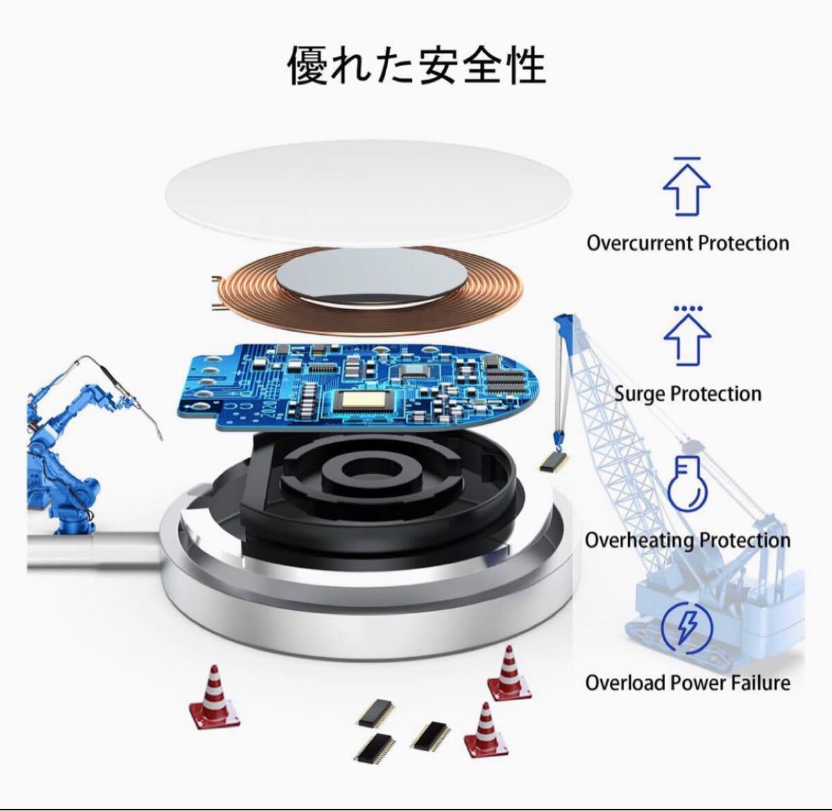 過電圧・過電流保護、高温制御及び異物検出機能を搭載し、熱伝導率の高い航空機用アルミ合金とアクリルを使用し、コイル部にある熱源(基盤)がコネクタ部にあるため長時間充電しても熱くなりません。