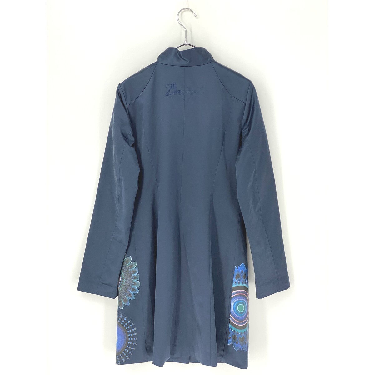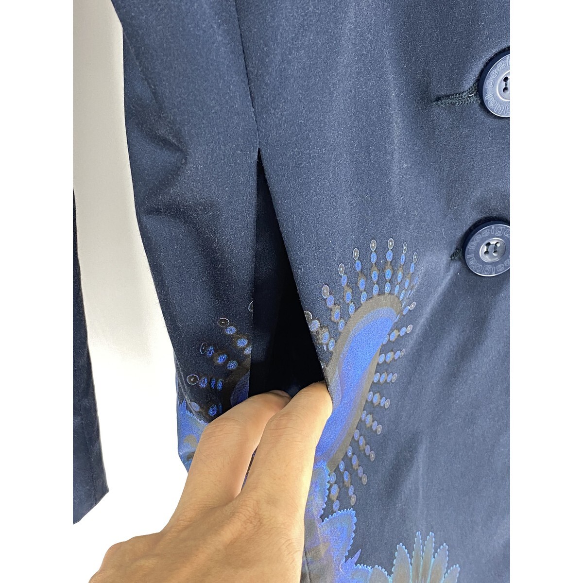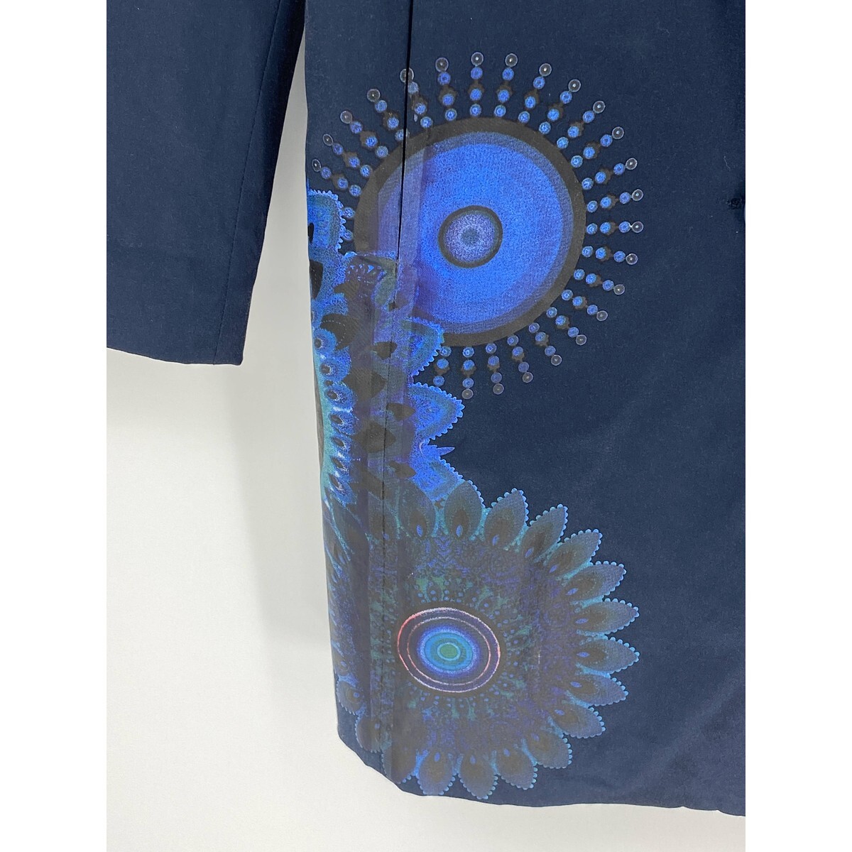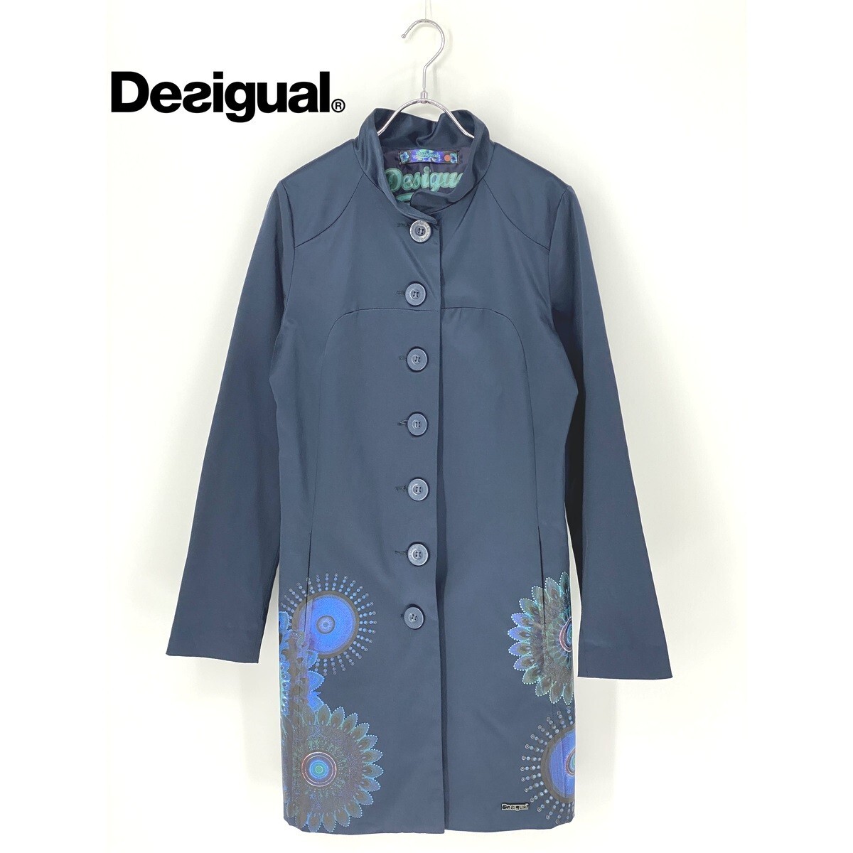 A9760/極美品 春夏 Desigual デシグアル コットン 花柄 プリント ショールカラー ロング 膝丈 ステンカラー コート 38 M程 紺 レディース