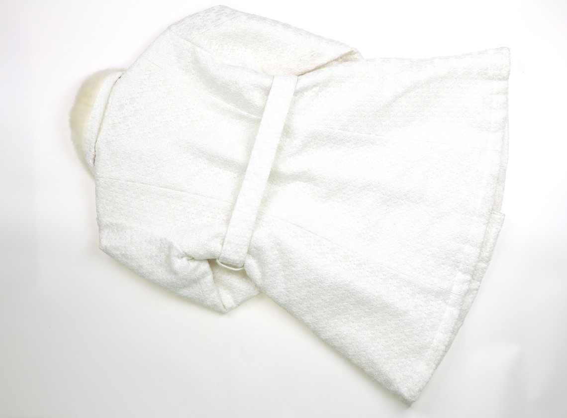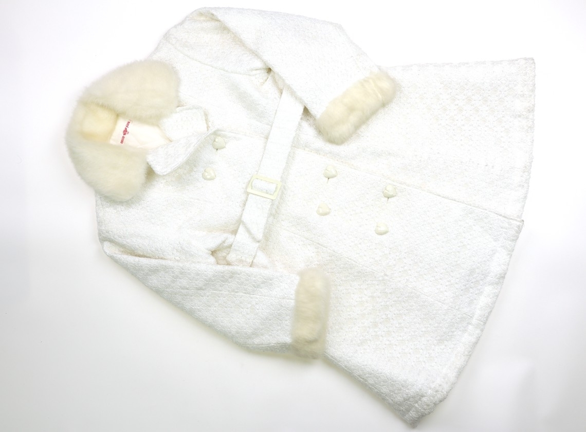 ポリエステル素材のレース生地。袖先と衿はファー生地。裏地はキルティング生地です。ベルト付き。レース生地に毛玉付着、薄い汚れがありますがまだまだ活躍してくれそうです。品質タグに表記はありませんが薄い中綿入りの様に見えます。