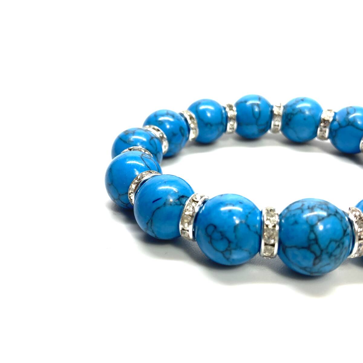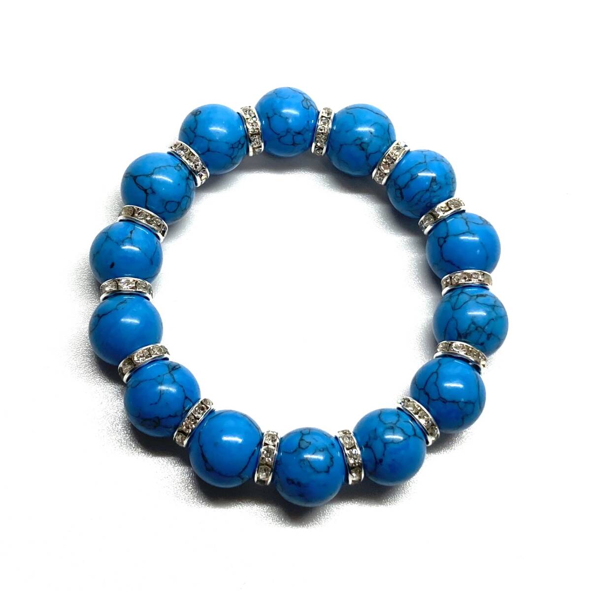 こちらは、14mm玉のターコイズを使用したブレスレットです。石との間にはロンデルを挟み高級感を演出しています。シンプルなデザインですのでどんなコーディネートとも合わせ易いブレスレットです。石大きさは14mm玉です。内周約17cmです。パワーストーンを付けてる方へのプレゼントにもお勧めです。14mmサイズのリクエストが多々ありましたので少量ですが販売しました。気になる方はお早めにどうぞ。