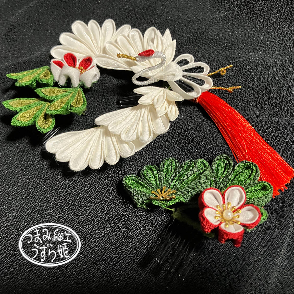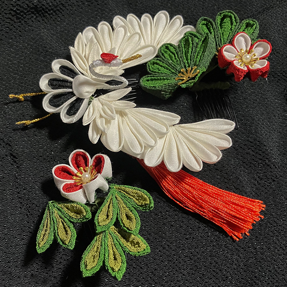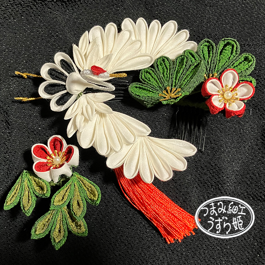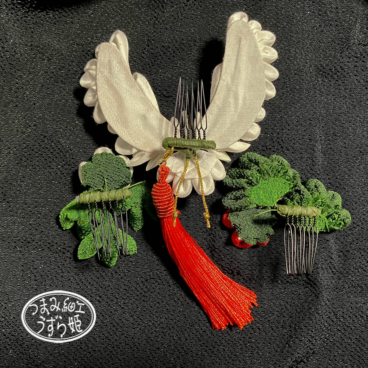 3点セット 吉兆紋 松竹梅 丸く翼を広げた丹頂鶴のコームかんざし つまみ細工
