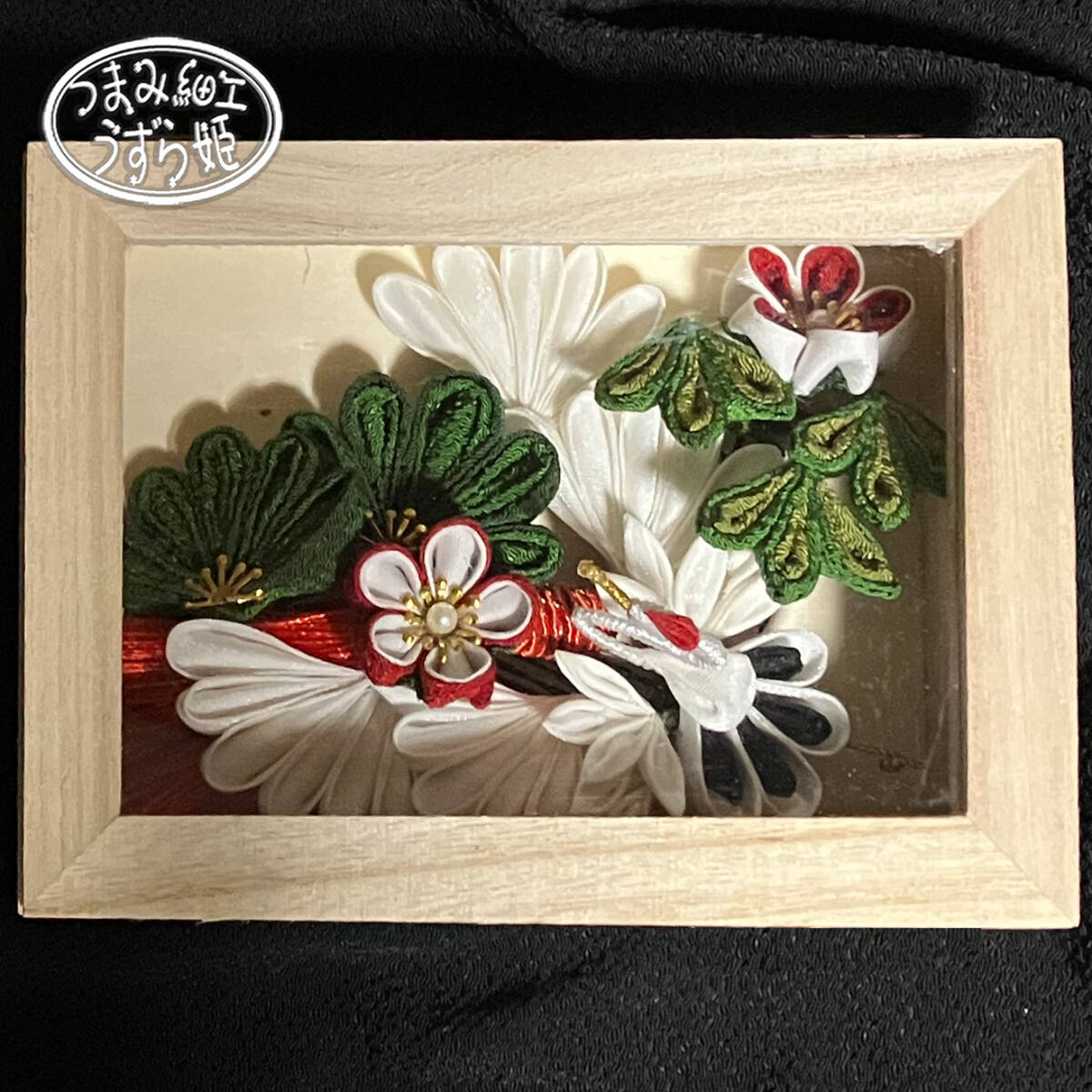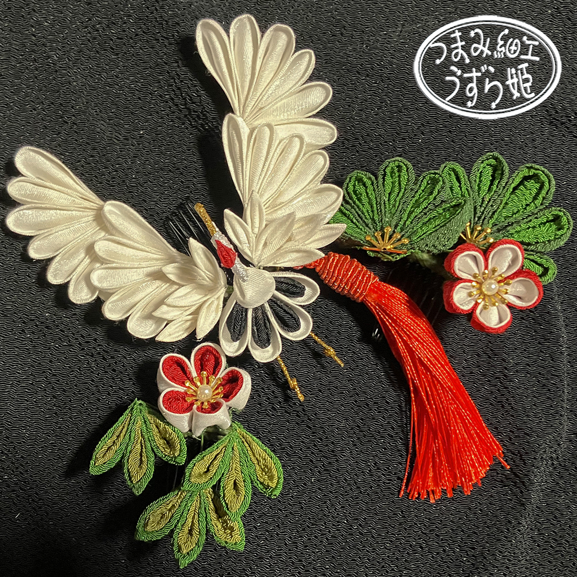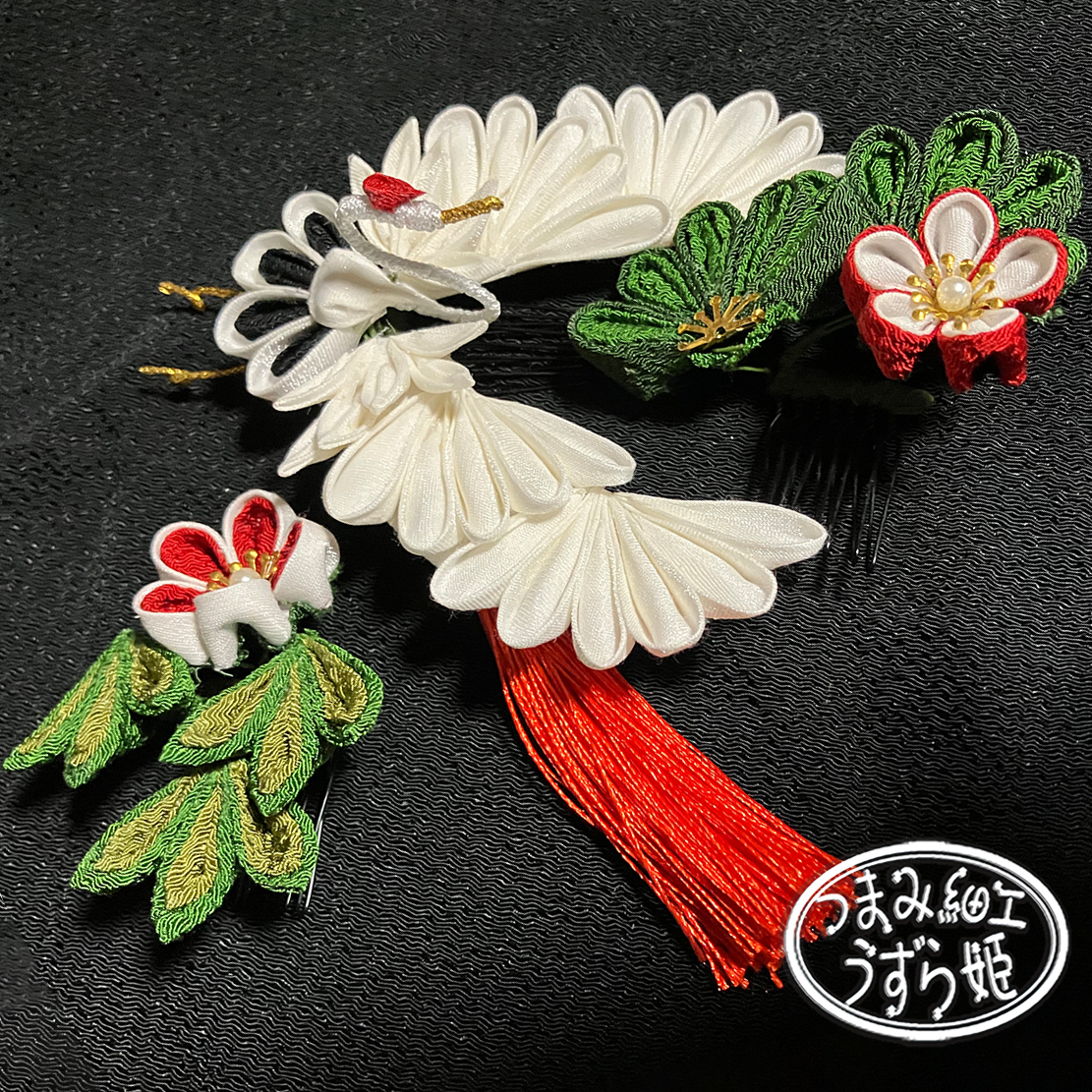 3点セット 吉兆紋 松竹梅 丸く翼を広げた丹頂鶴のコームかんざし つまみ細工