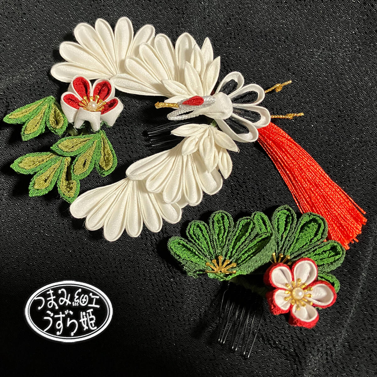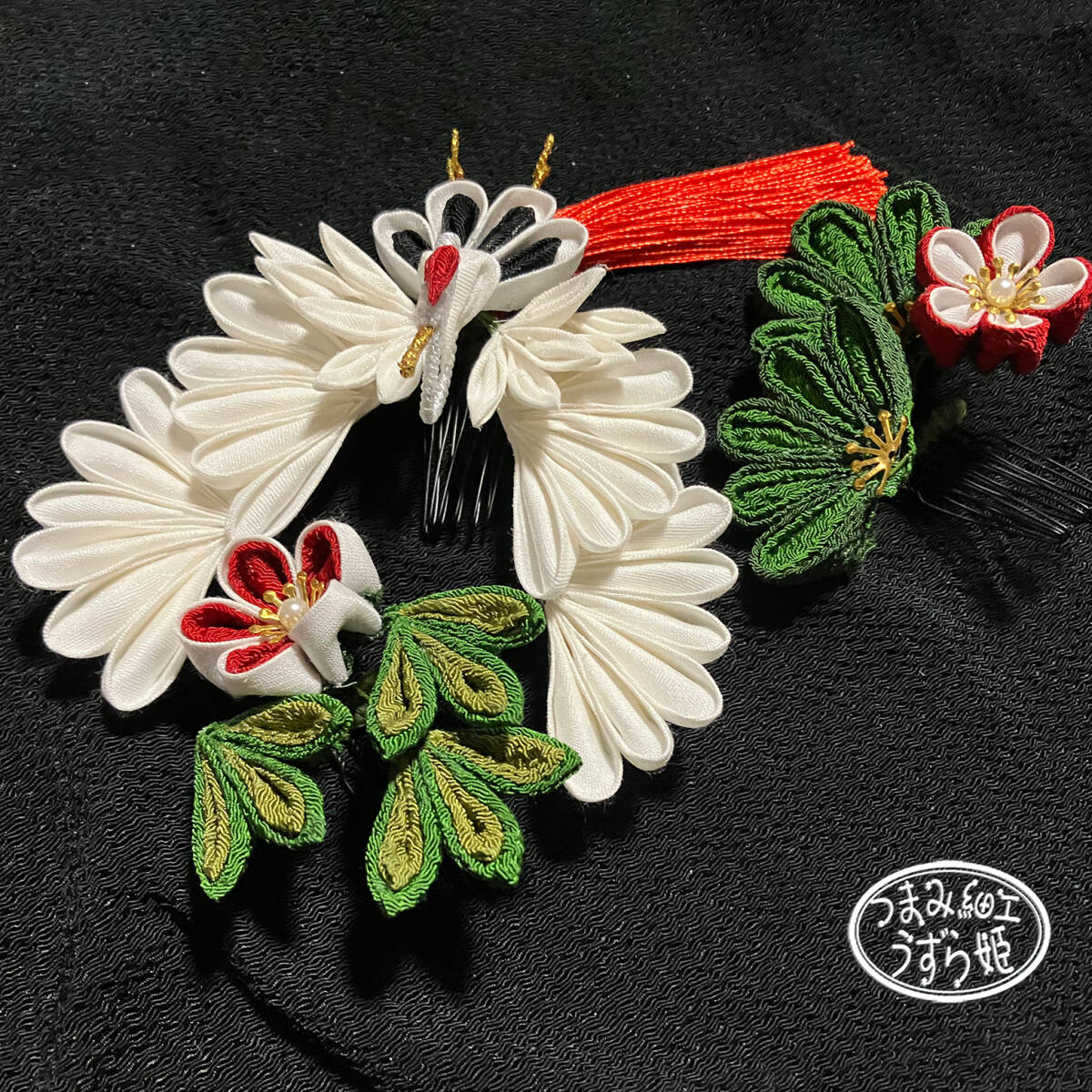3点セット 吉兆紋 松竹梅 丸く翼を広げた丹頂鶴のコームかんざし つまみ細工 和装 成人式 前撮 卒業式 ヘアアクセサリー 髪飾 ウエディング