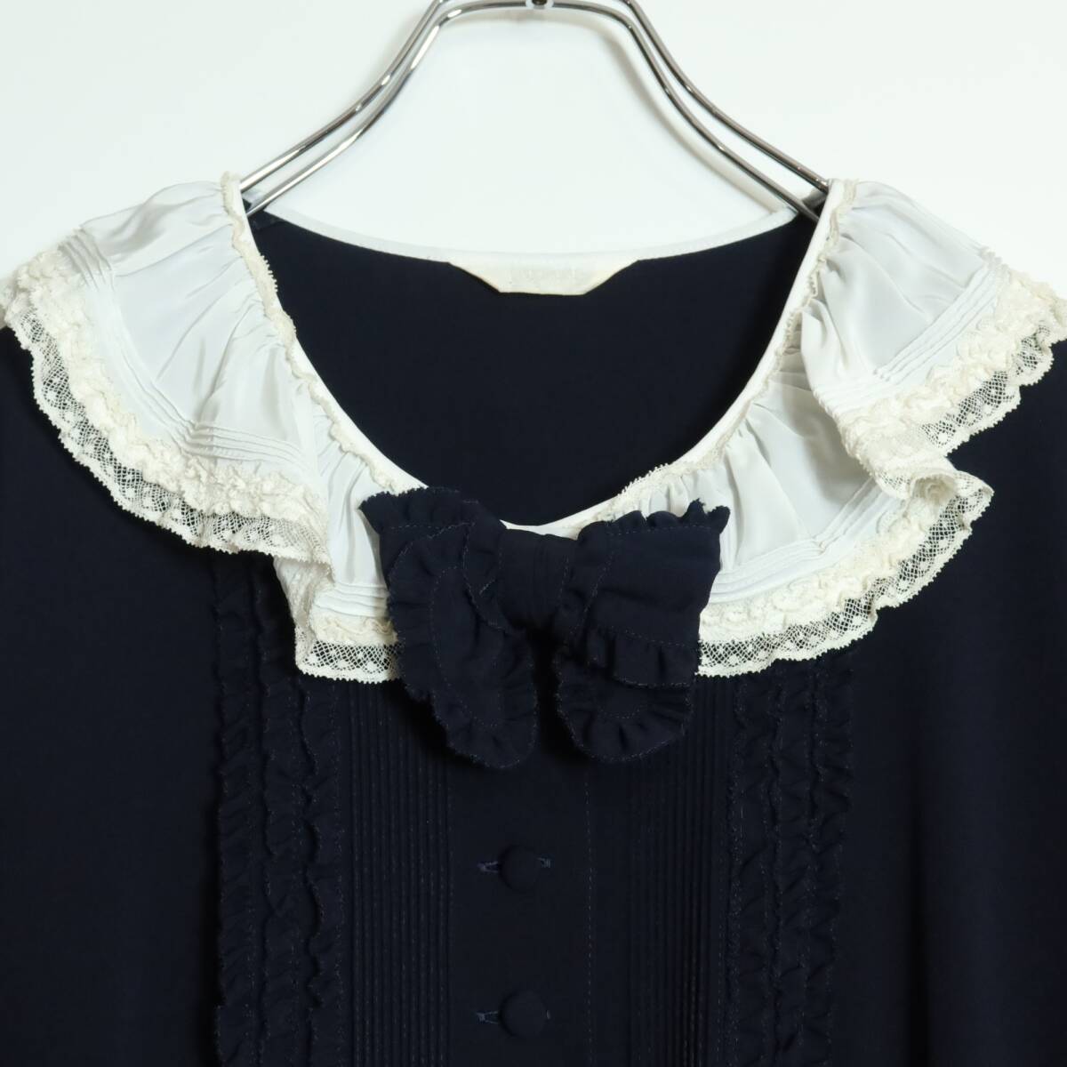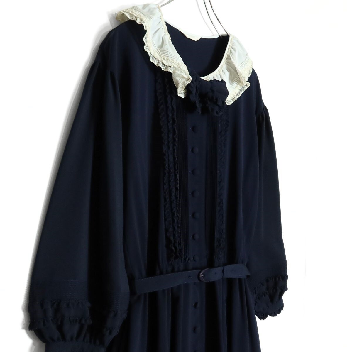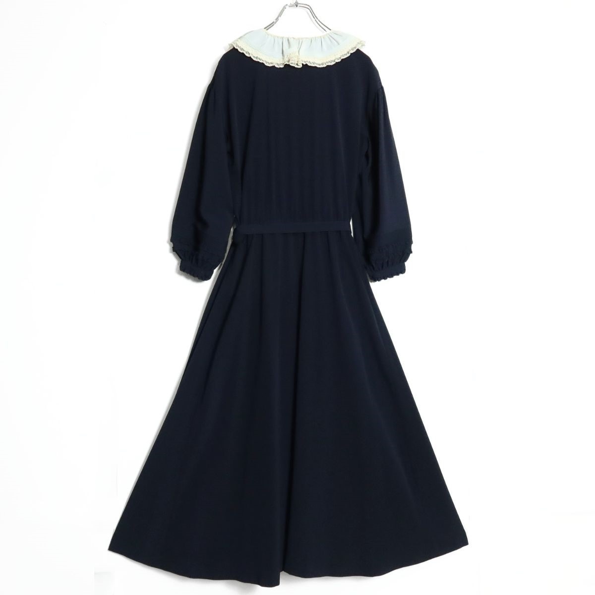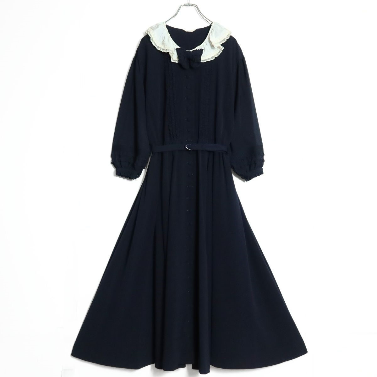 商品説明 | 【実寸約】肩幅50袖丈47バスト98ウエスト90~着丈130(cm) 【サイズ表記】なし。実寸をご参照くださいませ。 【素材】 ポリエステル100% 【状態】使用感少なめの美品 襟に極少々変色感がございますが使用感の少ないお品物です。 【デザイン】ネイビー系 上品でレトロ懐かしいデザインの無地ワンピースです。 七分袖のパフスリーブが可愛い♪ ウエスト総ゴムで着心地もバツグン! 前開きデザインで、スカートや他のワンピースとの重ね着にもピッタリ◎ 薄手/無地/ポケットあり/裏地あり ウエストベルト付き |