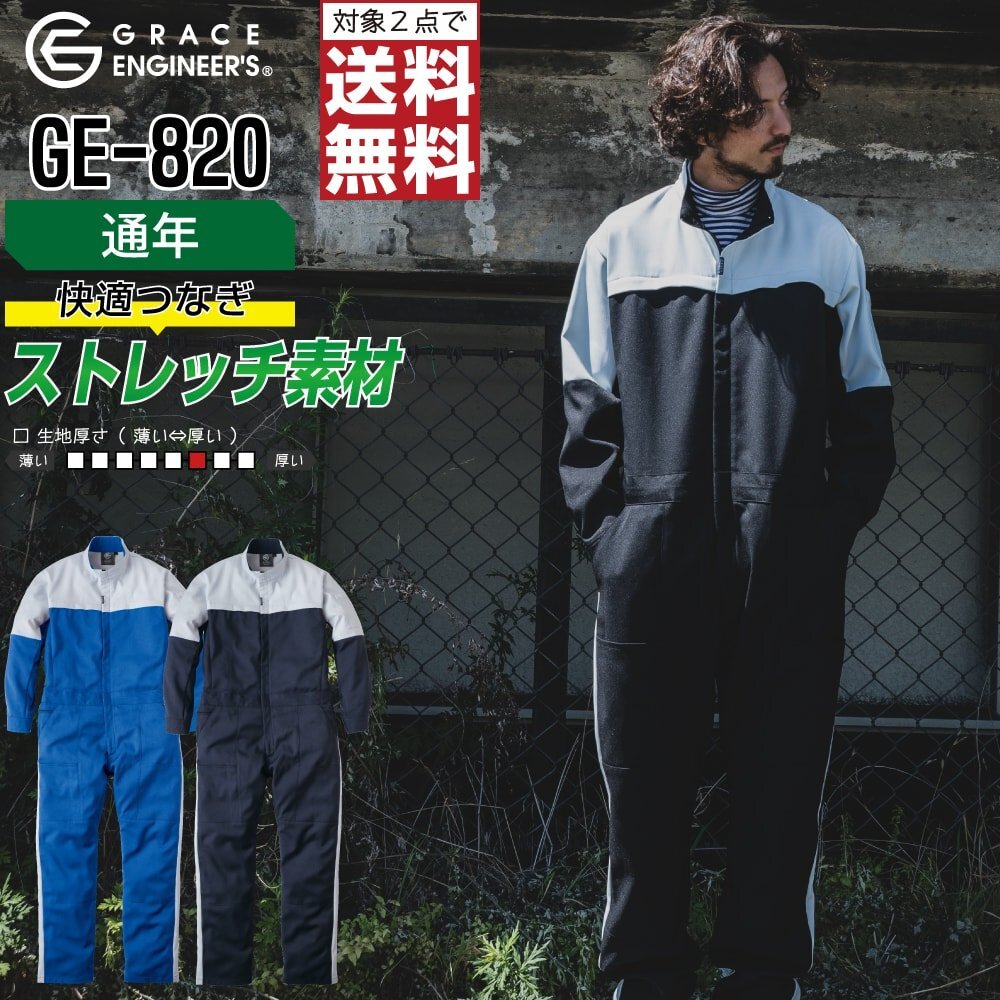 グレイスエンジニアーズ GE-820 帯電防止 長袖つなぎ 作業服 通年 ヒップオープン 色:ブルー サイズ:L ★ 対象2点 送料無料 ★