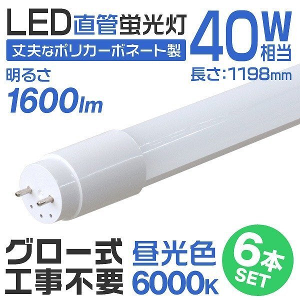 【6本セット】1年保証付き 直管 LED蛍光灯 40W形 120cm 工事不要 グロー式 高輝度SMD 照明 蛍光灯 LEDライト 昼光色 明るい 店舗 事務所