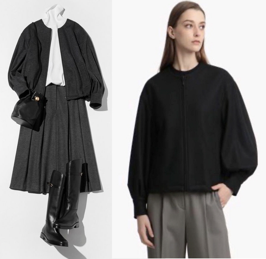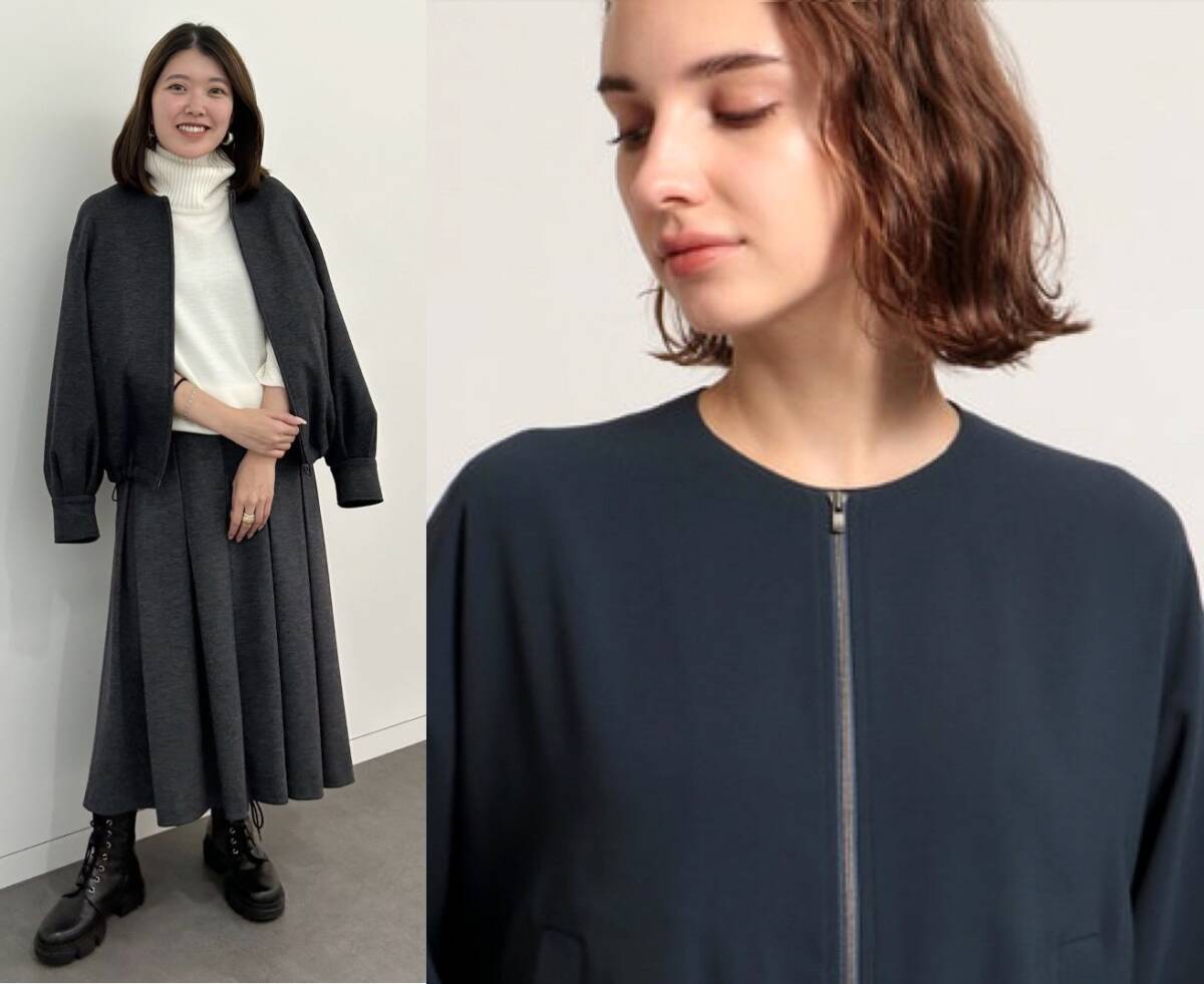ふんわり広がるスリーブラインが今年らしい、ジップアップジャケット。