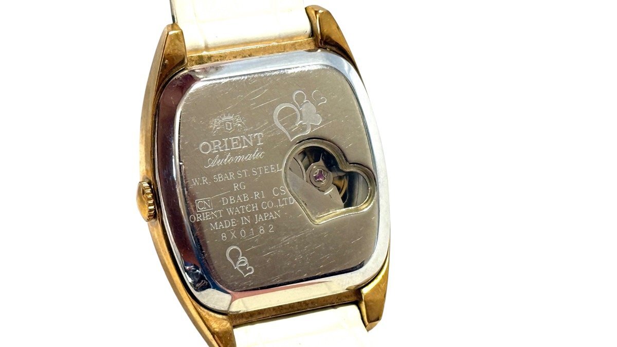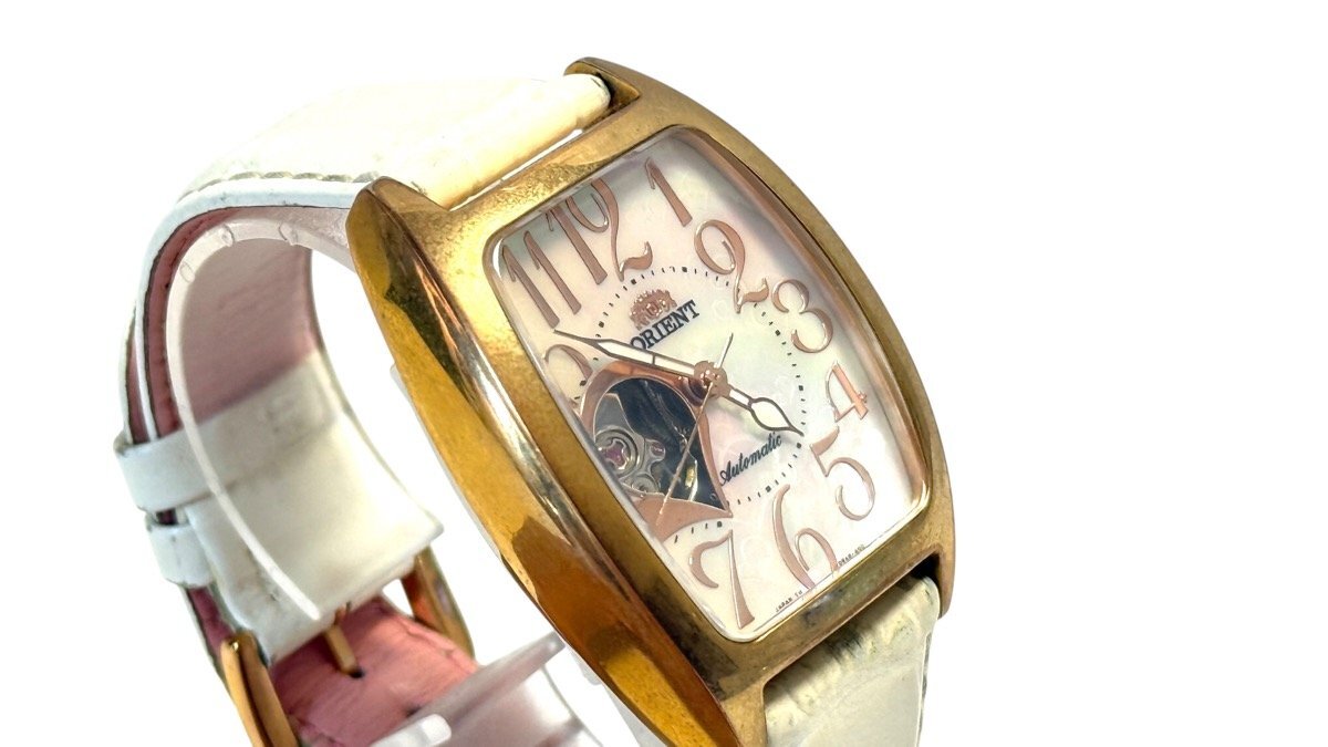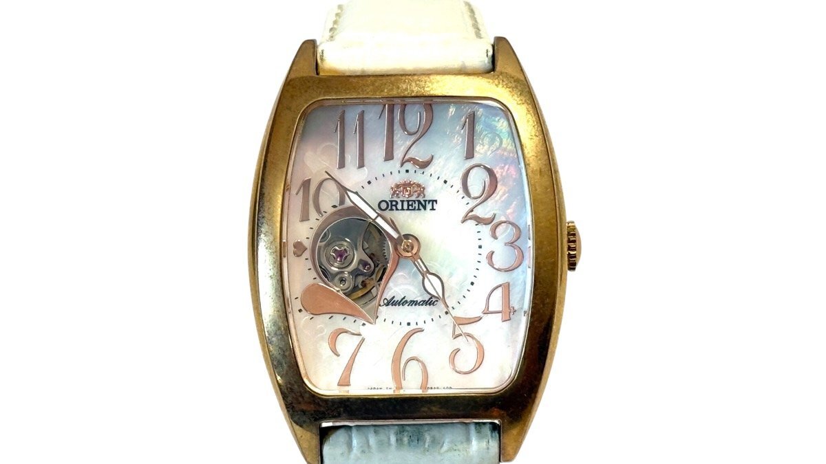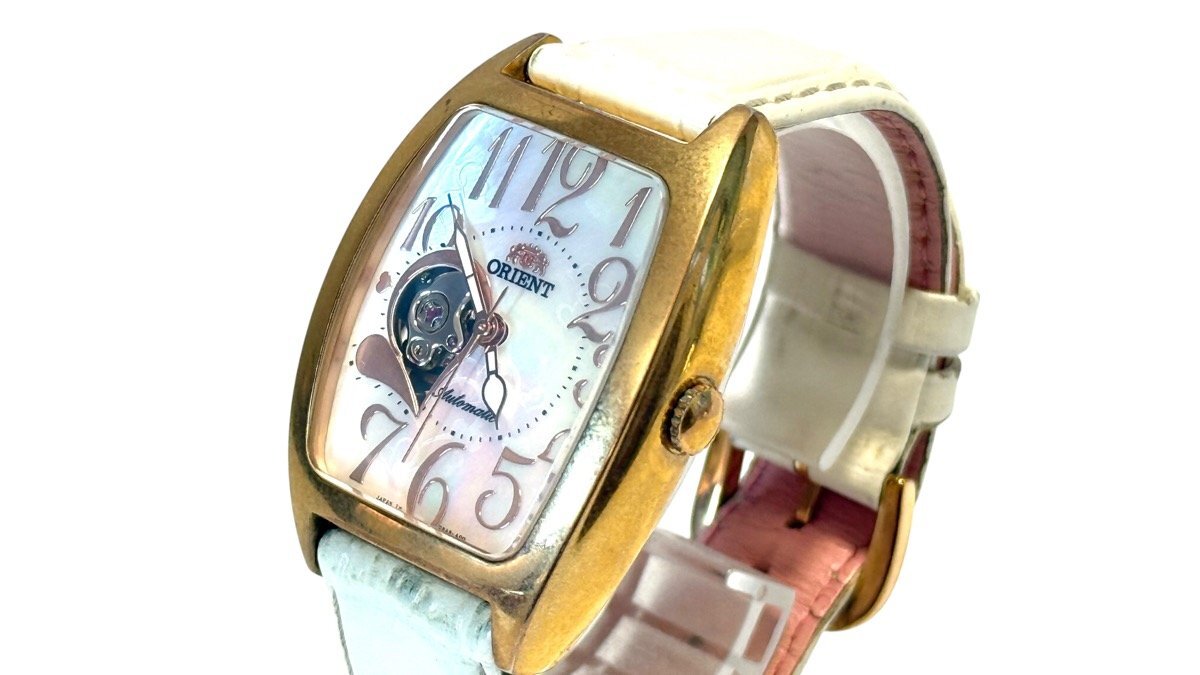 ご覧いただきありがとうございます! 【ブランド】 オリエント 【商品名】 腕時計 オリエントの腕時計です。シェル文字盤のオープンハートのデザインが素敵な時計です♪ 【ムーブメント】 自動巻き 【サイズ】 フェイス横3.2㎝ 【コンディション】 ランク『B』 補足:動いています。現状でのお渡しです。小傷が見られ、ベルトの穴の部分は写真のように少し傷んでいます。