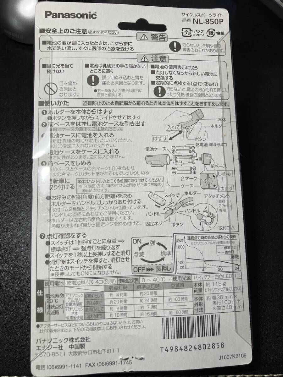 ☆ パナソニック Panasonic 自転車用ライト NL-850P-BK(ブラック) ハイパワーLEDスポーツライト 未開封です。ハンドル径22-32mm対応