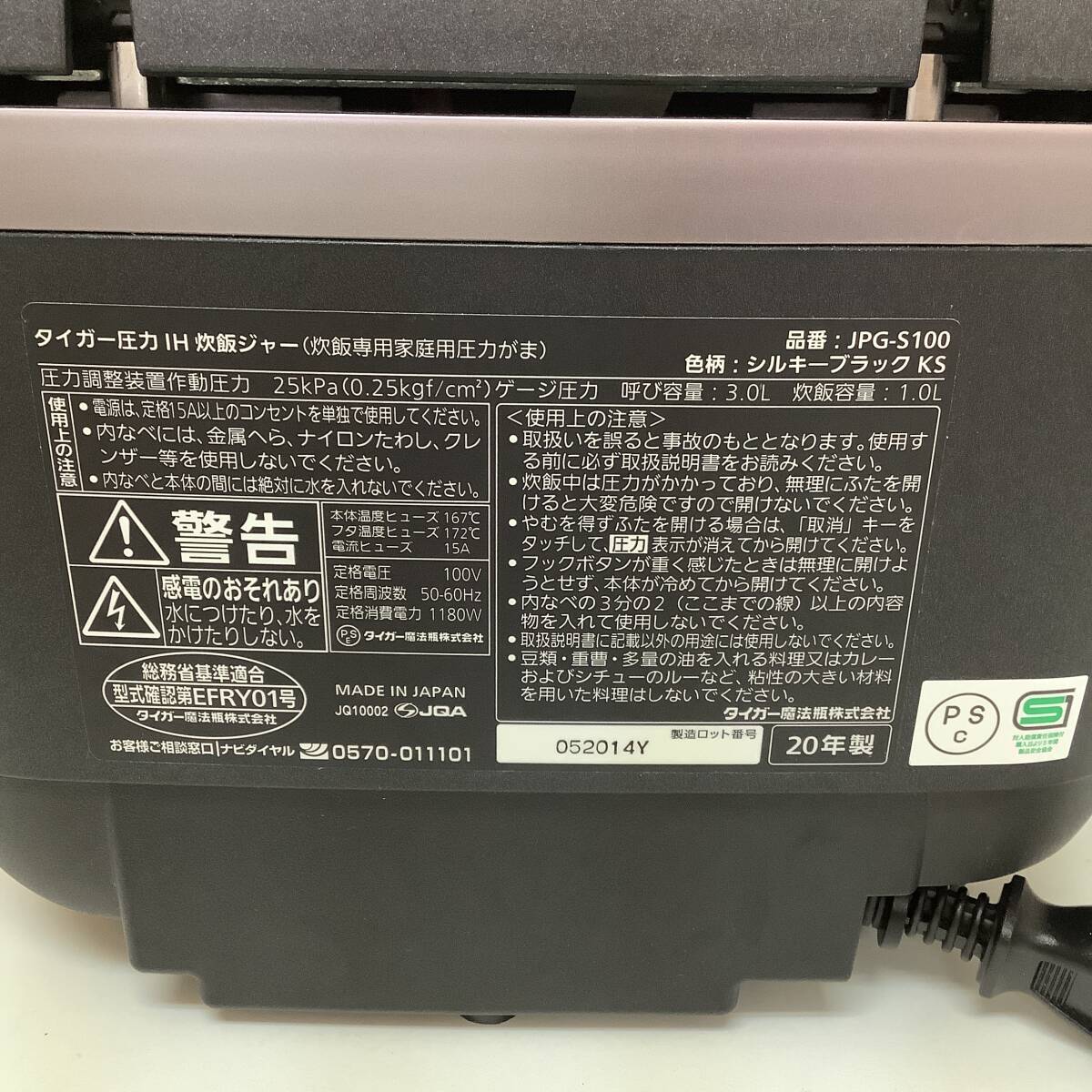 ス-284 中古品 TIGER JPG-S100 動作確認・簡易清掃済み 圧力IH炊飯ジャー 2020年製 1.0L シルキーブラック タイガー