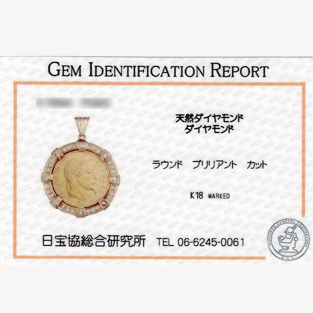 商品名 | K21.6 K18 29.01g ナポレオンIII世 50フラン 金貨 ダイヤモンド コイン トップ 日宝協総研カード鑑付 | ||