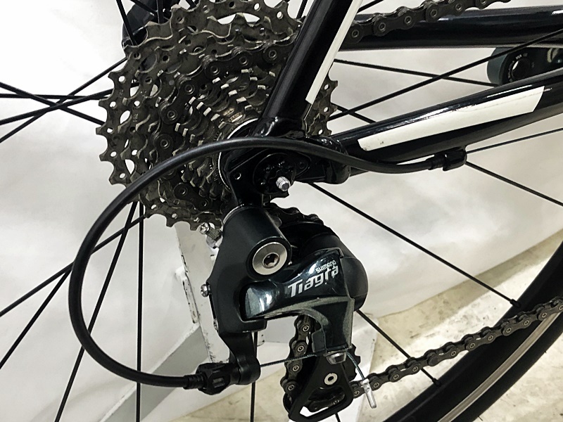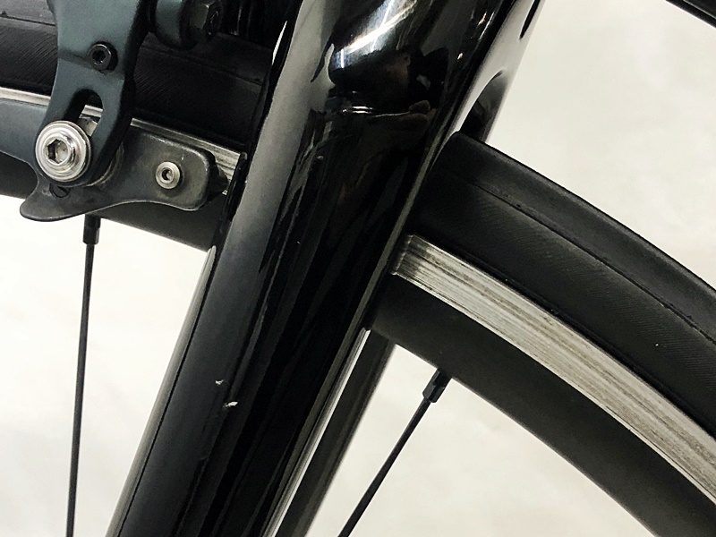 フレーム、その他外観:フォーク、トップチューブ、ダウンチューブ、ステー、STIレバー、クランク、リアディレイラー、リムにキズ、スレがあり、塗装の白い部分にはひび割れが見られます。