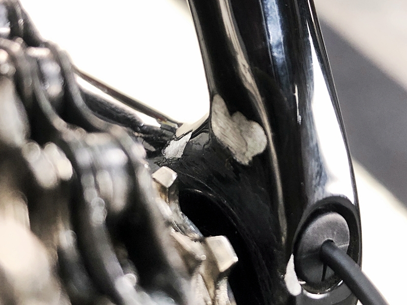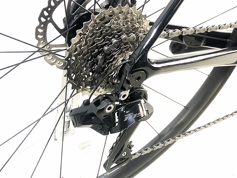 フレーム、その他外観:右BB周りと右フレームエンド内側にチェーン落ちキズがあります。トップチューブ、左右チェーンステー、左右フロントフォーク、右フレームエンド、リアディレイラー、STIレバー、シートポスト、サドルにキズがあります。