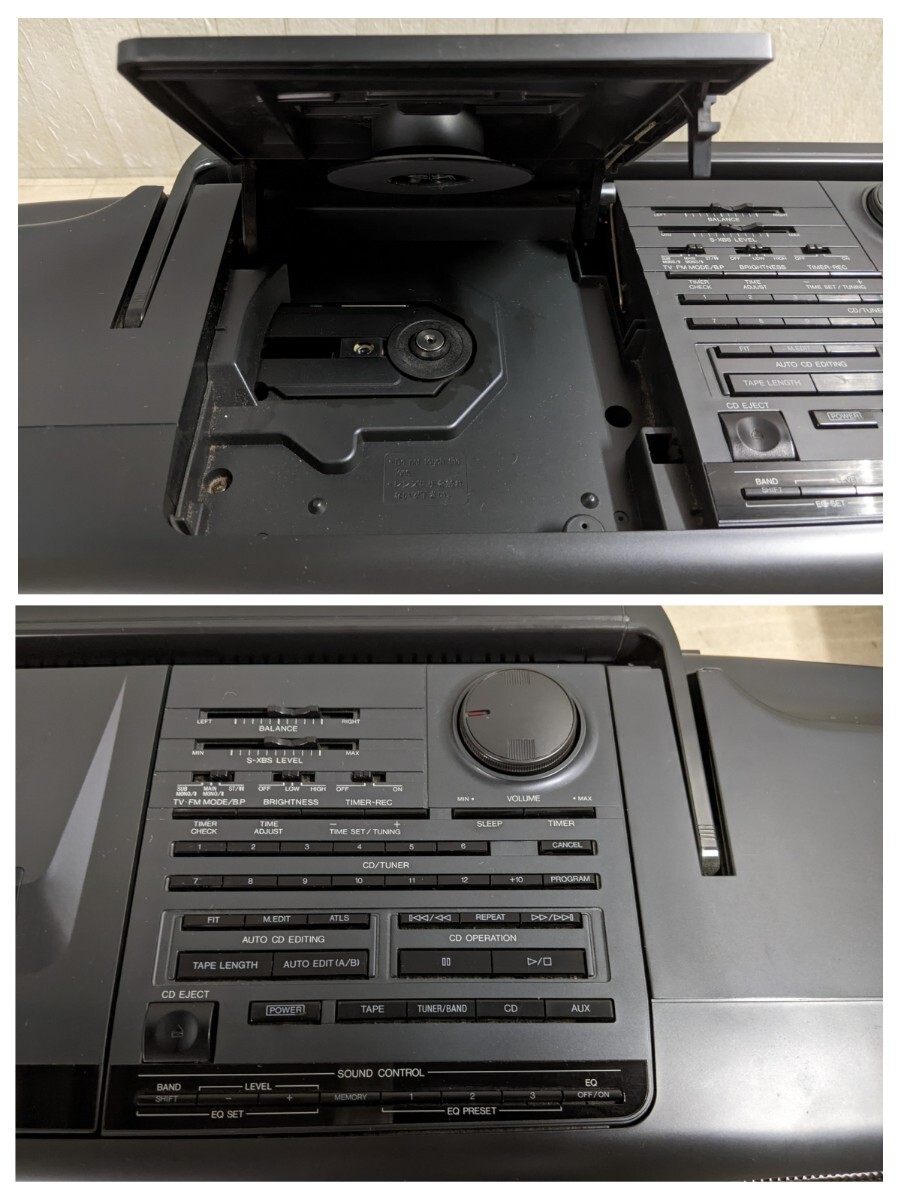 中古品となります。TAPE 1/2 共に 再生 停止 早送り 巻戻し ◯ CD 再生 停止 スキップ ◯ 音量変化 確認出来ました。AM/FM 受信 出来ませんでした。リモコン操作 確認出来ませんでした。現状品に なります。