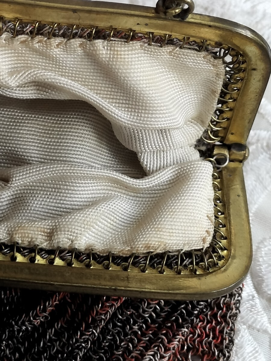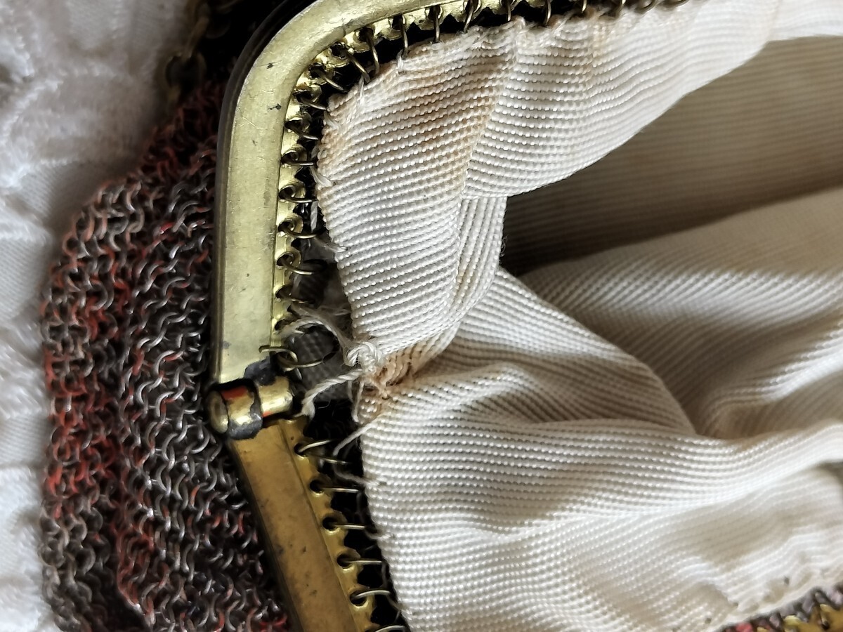 内側の布とがま口を縫ってる部分やメッシュの側面に綻びがあります。