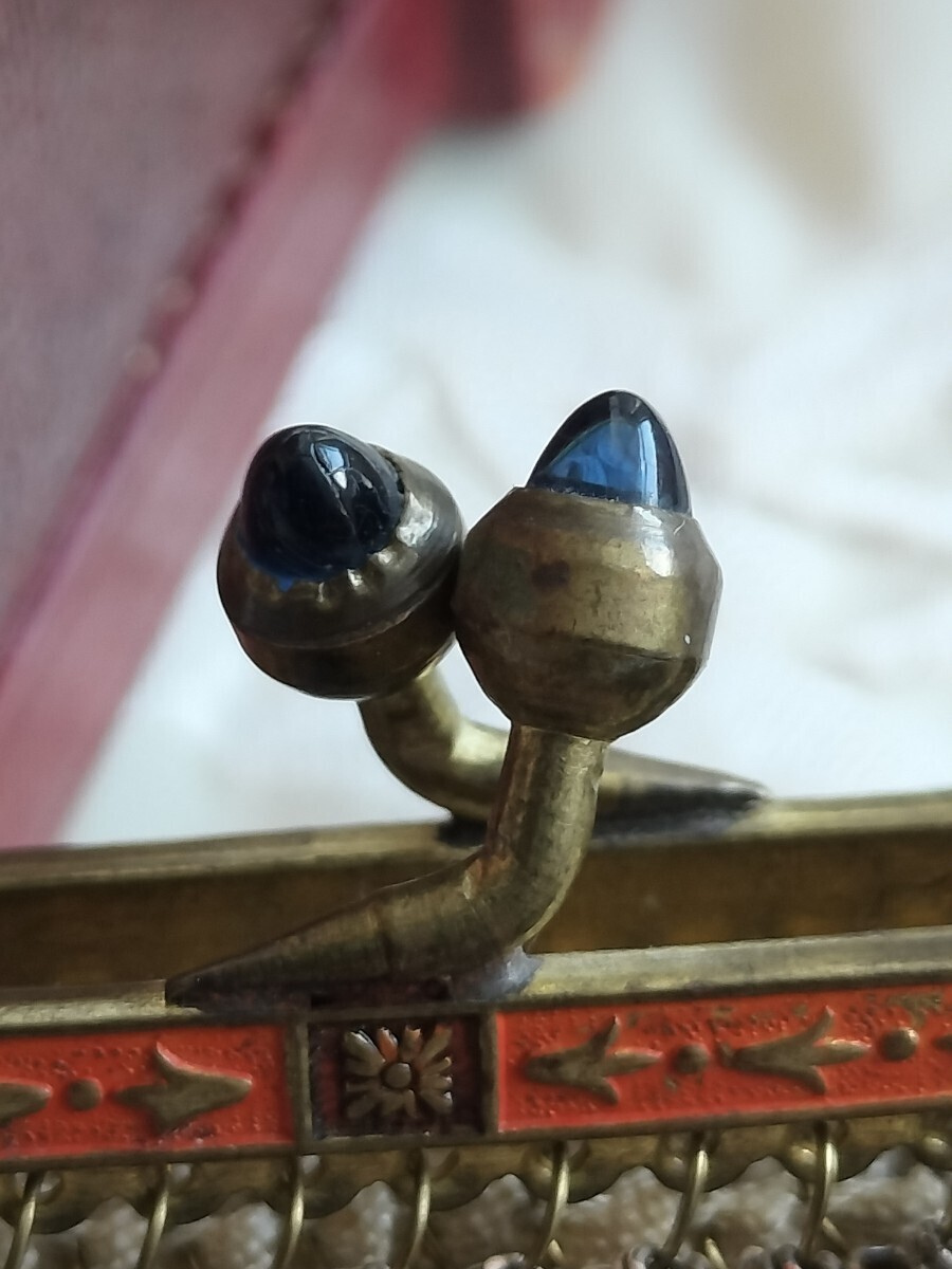 がま口の部分は山吹色に近いオレンジ色でペイントされ、お花の模様が装飾され、クラスプはコバルトブルーの美しいガラスが使われています。