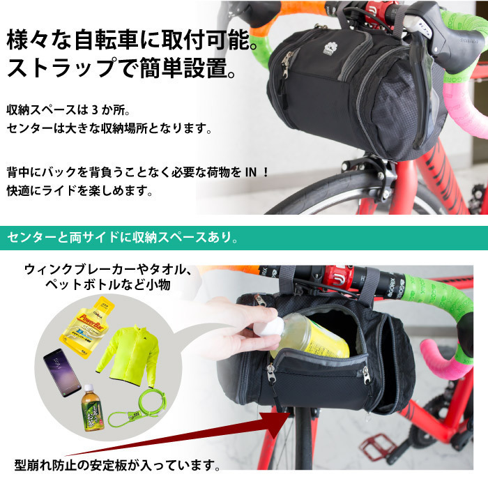 ウィンクブレーカーやタオル、ペットボトル(350ml)など小物なら しっかり収納できます。 背中にバックを背負うことなく快適にライドを楽しめます。 ストラップで取付けるので取付簡単で、脱着も即座にできます。 またストラップ取付なのであらゆる自転車に装着可能です。 ・3点で固定します。 ・ロードバイクやマウンテンバイク、クロスバイクあらゆる自転車に。 ・型崩れ防止の安定板が入っています。 ・センター収納とサイドに収納スペースあり。 ※装着する場合は、レバーの動きに干渉しないことをお確かめください サイズ約:約15cmx25cmx15cm 材質:210Dナイロン, ポリエステル ポケットの数:3 重量:210g 留め具:ファスナー |