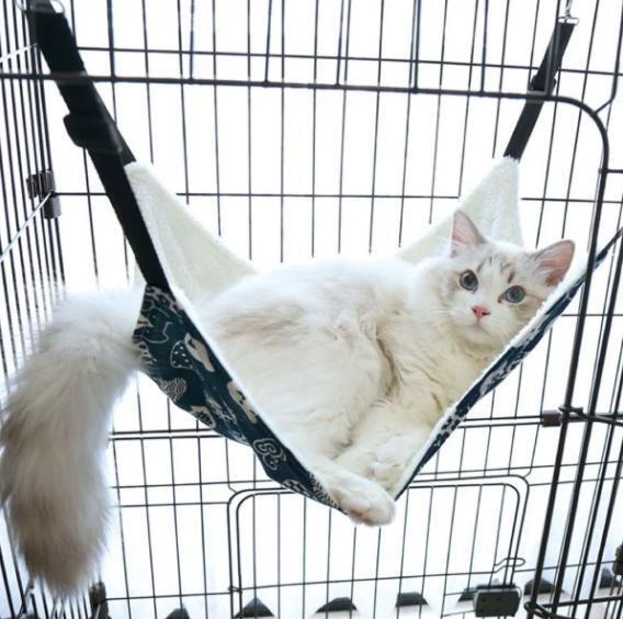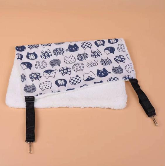 この猫用ハンモックは、青地にさまざまな猫のイラストが描かれたデザインが特徴です。