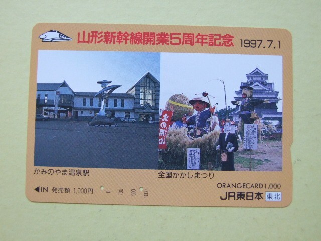 ◇オレンジカード 使用済 多穴券◇JR東日本 東北『山形新幹線開業5周年記念 1997.7.1 かみのやま温泉駅/全国かかしまつり』USED品 009706