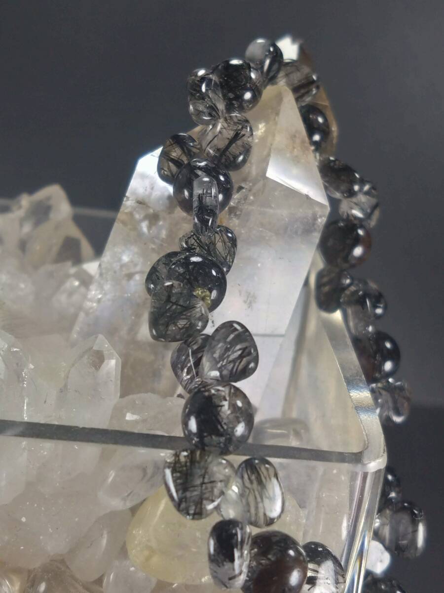 今回のブレスレットはブラックルチルインクォーツと名称しているブラックトルマリン(ショール)インクォーツになります 透明感が有り結晶内のショールトルマリンが一目瞭然で無数に飛び交っているのが確認出来るのが嬉しい逸品です ルーペ等で眺めるわくわく感が生まれます 脱着もゴム式なので急いでいる時には楽々アイテムだと思います ブレスレットの複数使いにも最適です