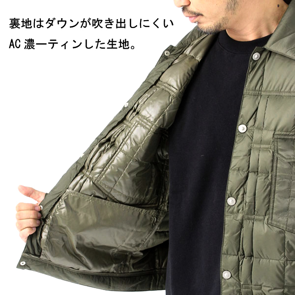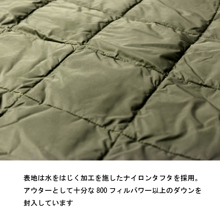 ・表地は撥水加工を施した400Tのナイロンタフタ生地、裏地はACコーティングを施したダウンが吹き出しにくい生地を使用。