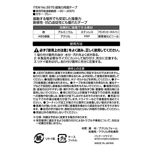 説明 ■車外用 ■ミラーカバー・エアロアンテナなどの取り付けに ■振動する場所でも安定した接着力、耐候性・凹凸追従性にも優れたテープ 【効果的に接着できる素材】 ・鉄 ・アルミニウム ・ステンレス ・PC(ポリカーボネイト) ・ABS樹脂 ・アクリル ・FRP ・硬質塩化ビニール ※製品の仕様は予告なく変更する場合がございます。 ※ご購入の前にホームページをご確認ください。