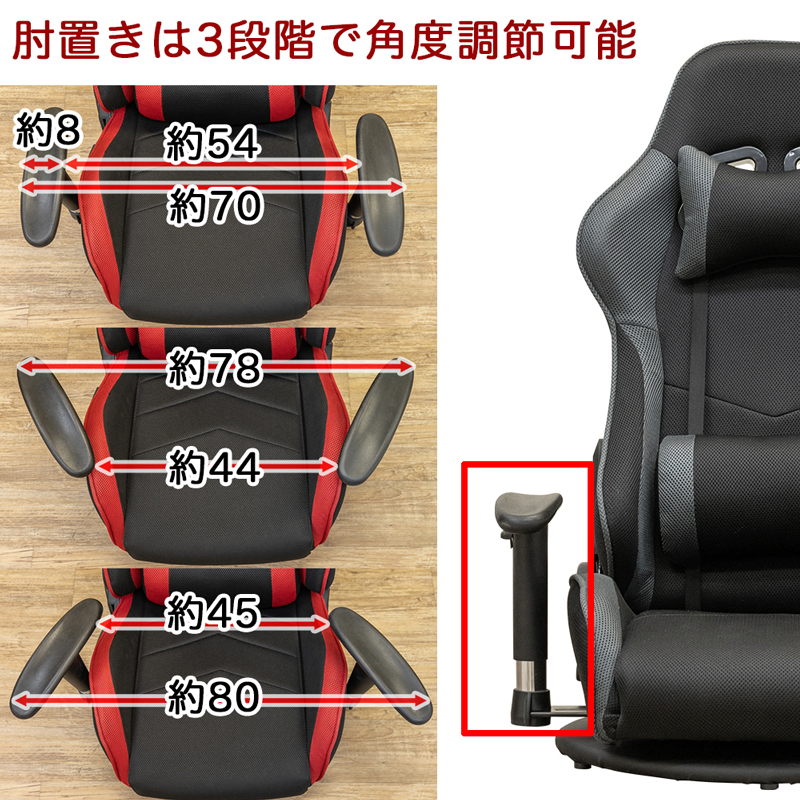 | サイズ | (W)幅70~80×(D)奥行60~106×(H)高72.5~93.5cm 座面高:約16cm 背もたれリクライニング:10段階、 肘:昇降/3段階角度調節 |
