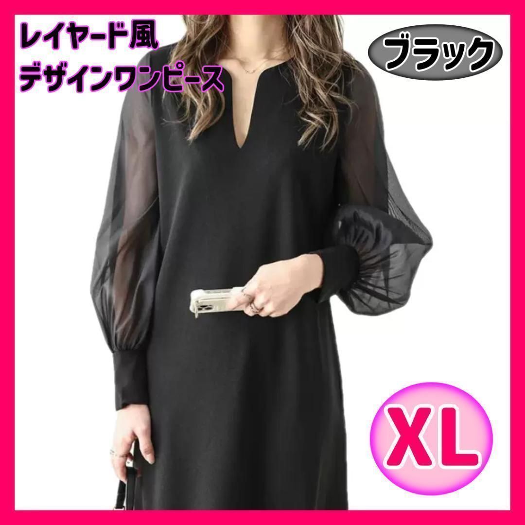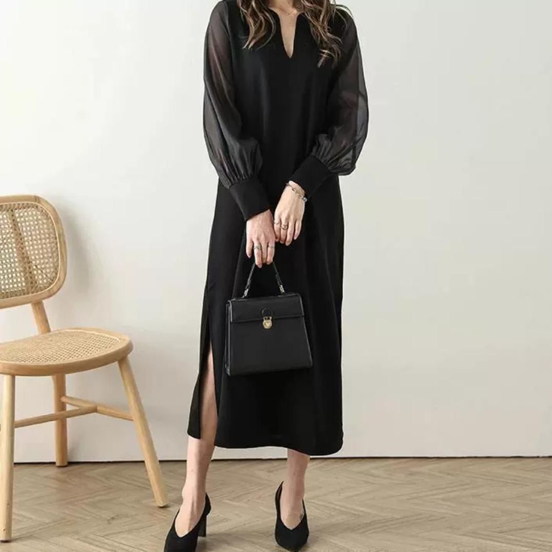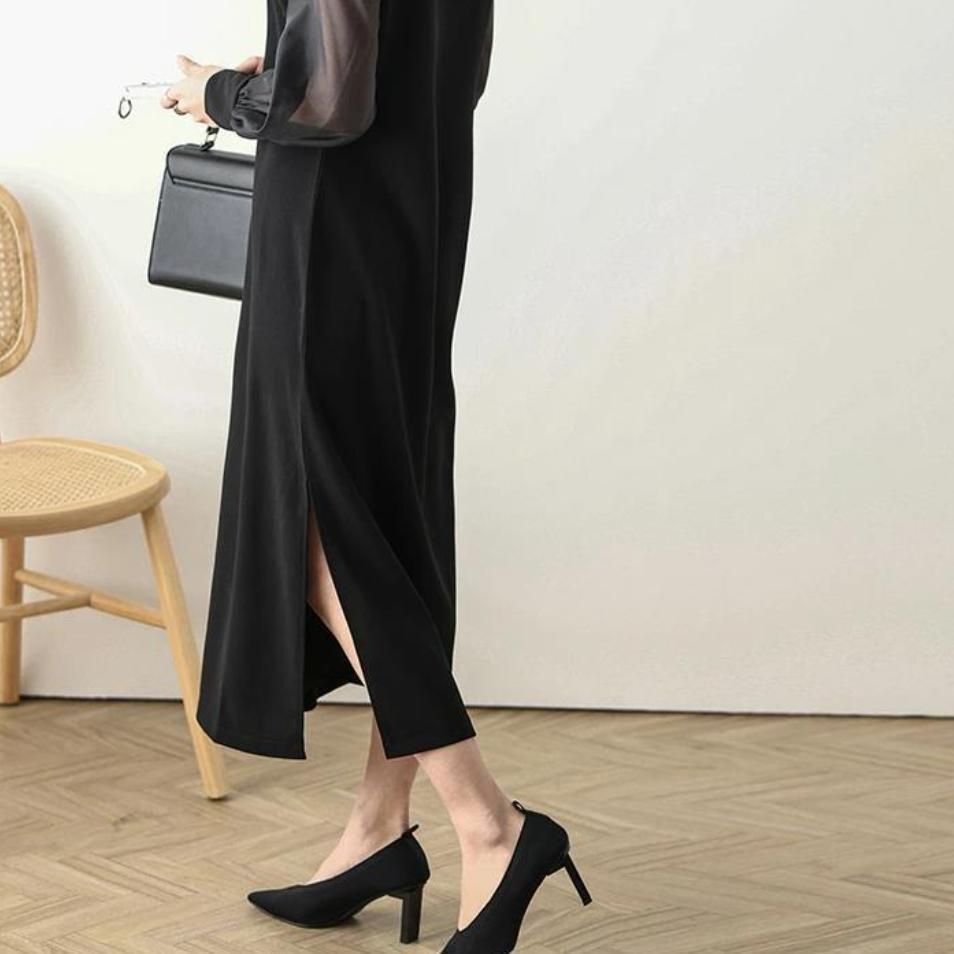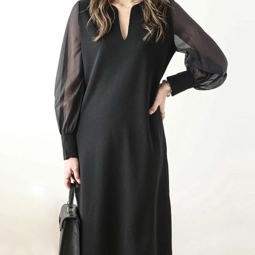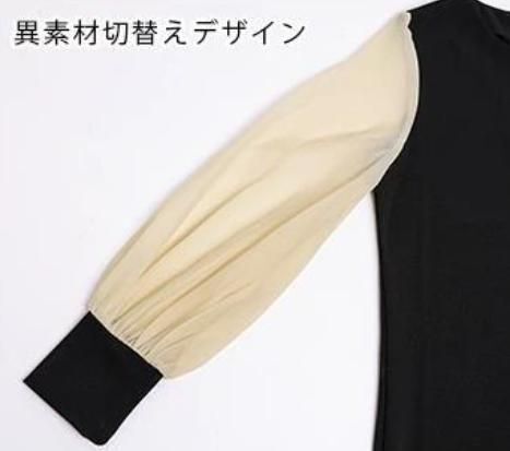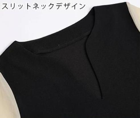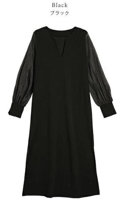 異素材シアースリーブスキッパネックスリットワンピース シフォンスリーブ ワンピース 透け感 シアー スリットネック 長袖 レディース おしゃれ ブラック 黒 フォーマル 入学式 950