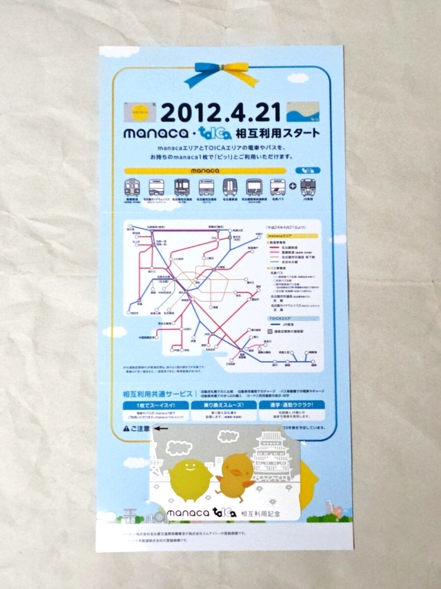 ●2012年4月21日にmanacaとtoicaの相互利用開始記念として発売されたICカードのうち、名鉄の各駅にて限定で販売された記念manacaとなります。(カード発行元は名鉄が提携している子会社の株式会社エムアイシーとなります)