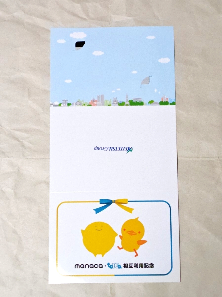●「名鉄 記念manaca manaca・toica相互利用スタート記念 台紙付(残高なし・デポジットのみ) マナカ 名古屋鉄道」となります。