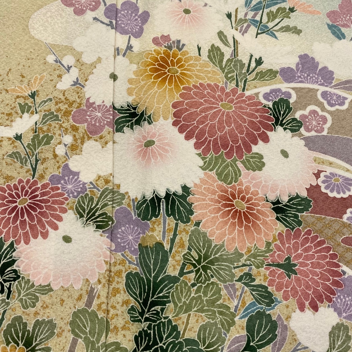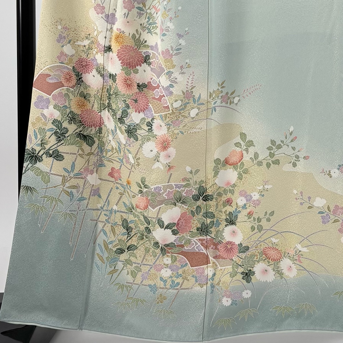 | 訪問着 秀品 扇面 菊 金彩 ぼかし 薄緑 袷 身丈163.5 裄丈67.5 L 正絹 【中古】 |
