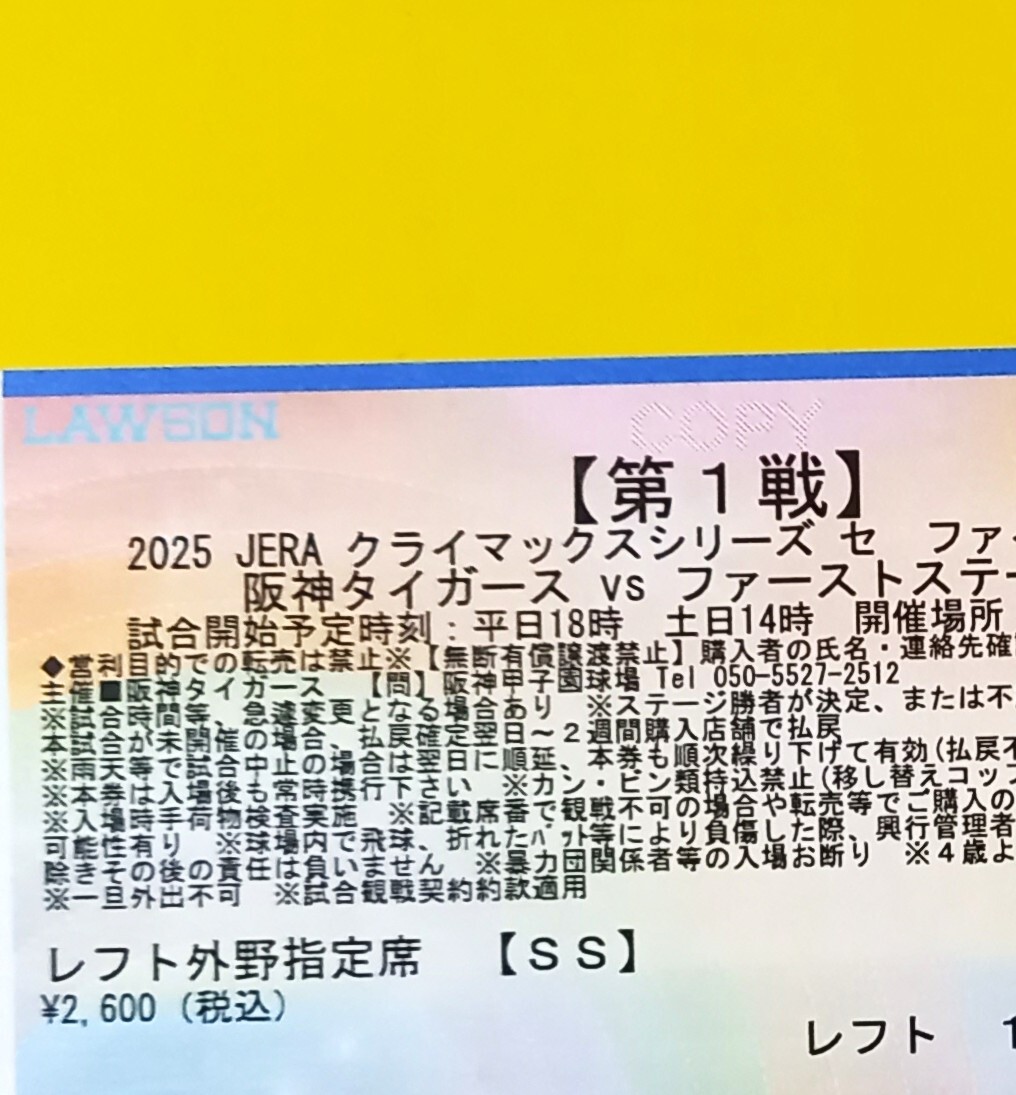 通路横 1枚 10月15日 レフト外野指定 下段 クライマックスシリーズ ファイナルステージ 第1戦 甲子園球場 CS 阪神タイガース vs 1st勝者