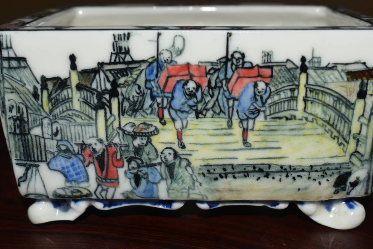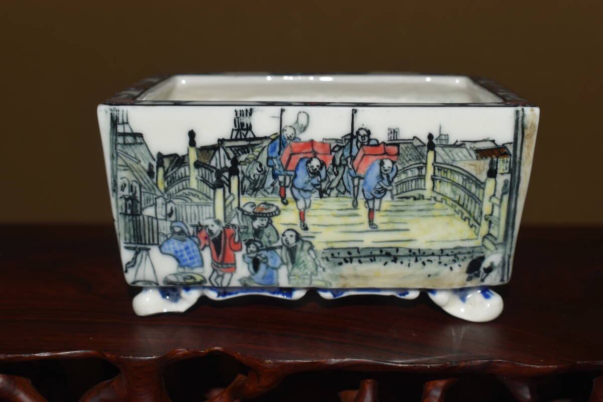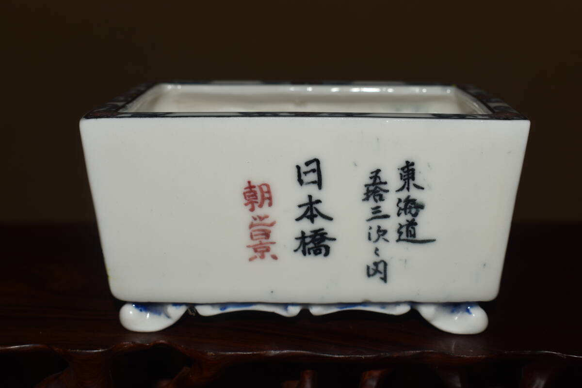 サイズ13,2x9,5x7,0cm 人気絵鉢作家<貴重作、唐峰・色絵五十三次、日本橋図・繊細画・実用性抜群・小品サイズ>切立ち雲脚長方鉢のご紹介です・・・・貴重作・色絵の五十三次日本橋図が繊細に描き込まれ、実用にも優れた素晴らしい逸品です・目立つ傷はありませんが、脚に削げがあります。ガタはありません。・・・・・ 状態を良くご確認の上、ご入札宜しくお願い致します。 その他、大変古い物ですので縁・足等にホツ・スジ・カケ等がある場合がございます。画像を良くご確認の上、御入札宜しくお願い致します。完品をお求めの方は入札をお控えお願い致します。*注意事項* オークション終了後48時間以内に必ずご連絡をお願いします。ご連絡がない時は、ご購入意思がないと判断し、落札者さま都合のキャンセルとさせて頂きます。再三のご連絡を差し上げても、ご連絡がない場合は、時点繰り上げとさせて頂きます。マイナス評価の多い方や新規の方を削除する場合がありますので、ご了承下さい。また、入札価格が低価格の場合は取消終了とさせて頂く場合がございますので、ご了承願います。古い物等ございますので小さな傷等は、見落とす場合がございますので、写真を良くご覧になり納得の上ご入札して下さい。また、完品をお求めの方は入札をお控えお願い致します。キズ・破損等のご連絡は商品到着5日以内にご連絡ください。それ以降は対応致しかねますので到着後、商品を必ずご確認ください。輸送中の事故(鉢が割れる、枝が折れる等)につきましては商品到着時に確認し取引ナビまたは、お電話にてご連絡下さい。