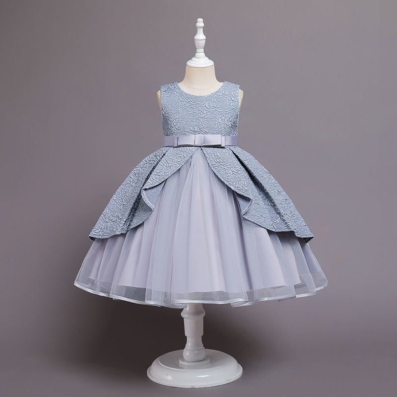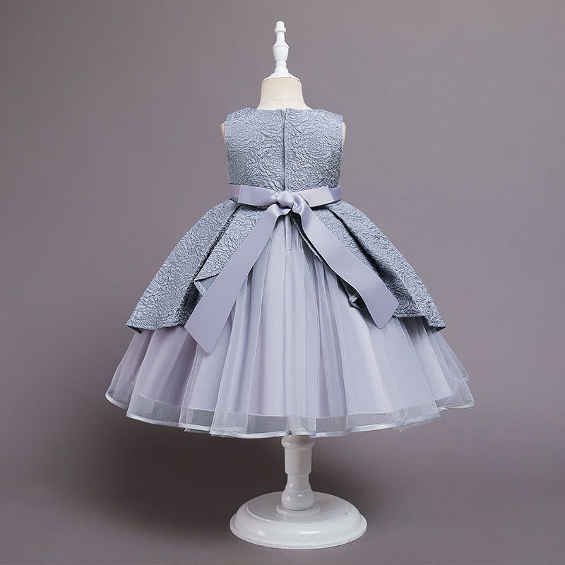 高級なグレーの膝上の丈になり、とてもふんわりのドレスです。結婚式、誕生日、七五三の他、バイオリン発表会、ピアノ発表会、エレクトーン発表会などにもぴったりです。 【素材】ポリエステル