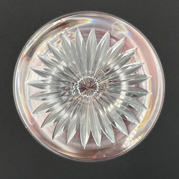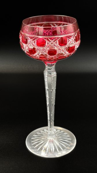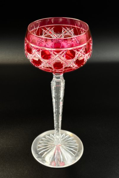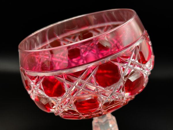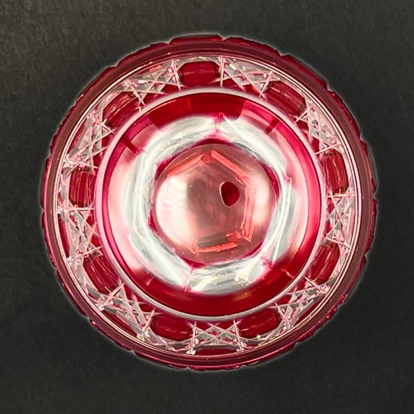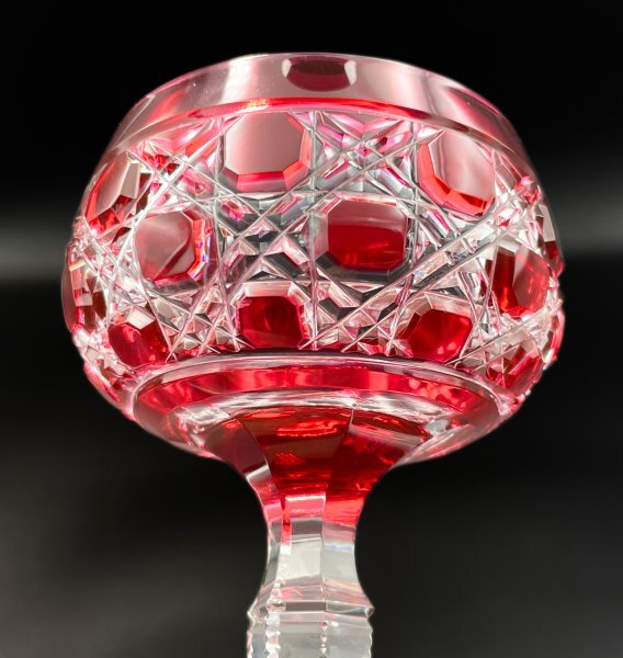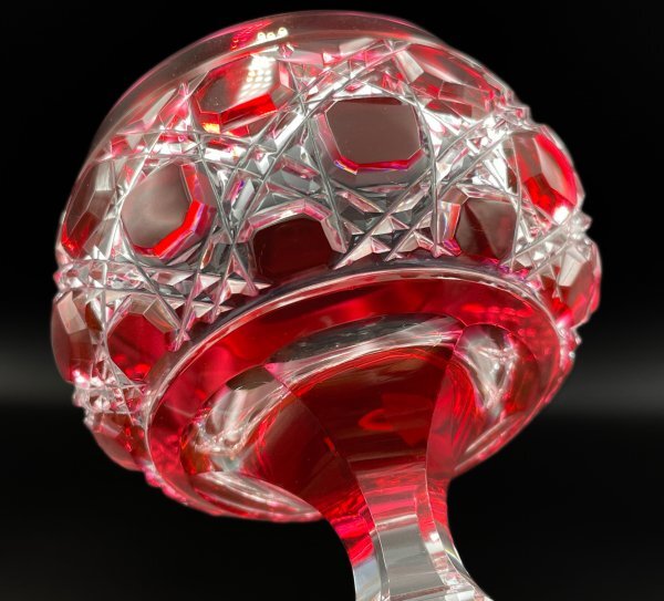 ステム(脚部)は細身で高度なカットが施され、台座裏面には放射状のスターカットが輝きます。被せガラスとカット技法の調和が見事な逸品です。