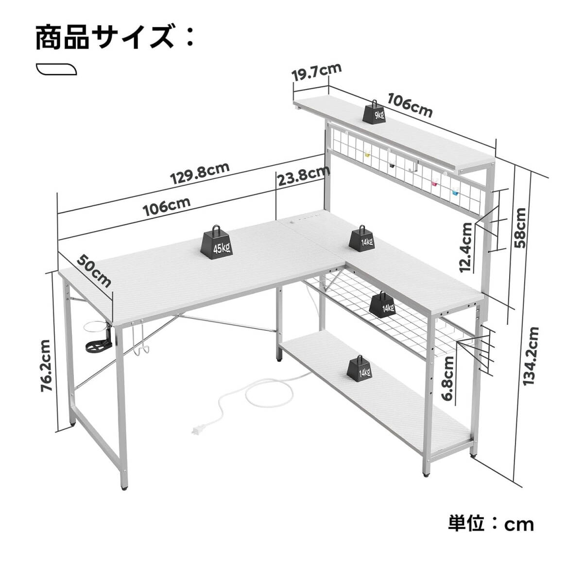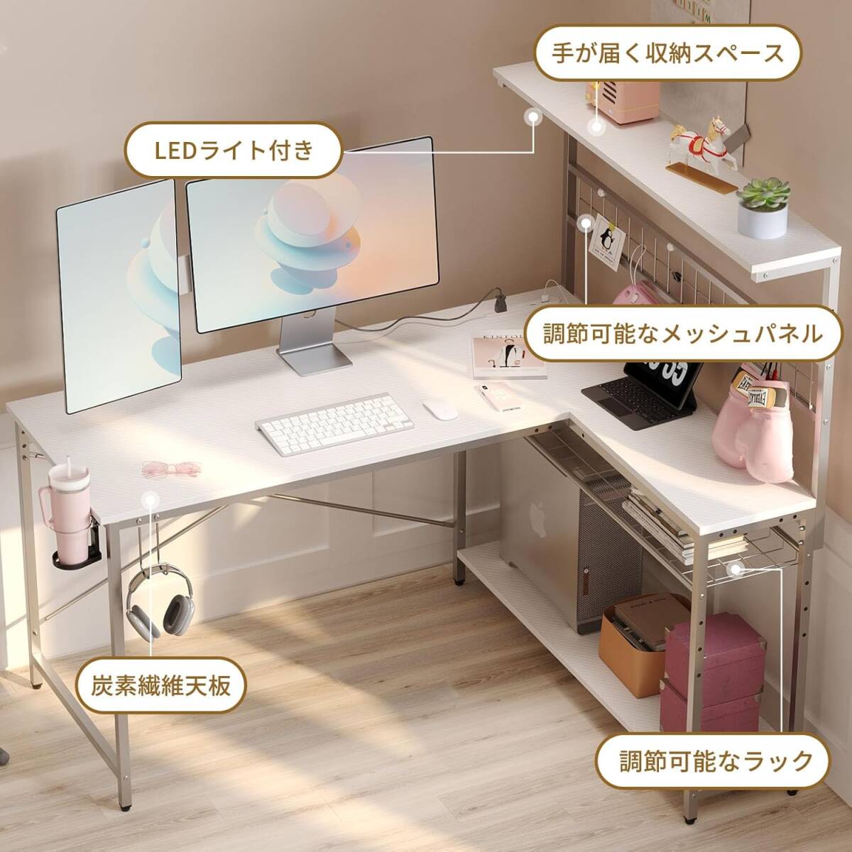 ゲーミングデスク 炭素繊維ホワイト 幅130cm L字 コンセント付き Type-C パソコン 机 PCデスク ラック LEDライト