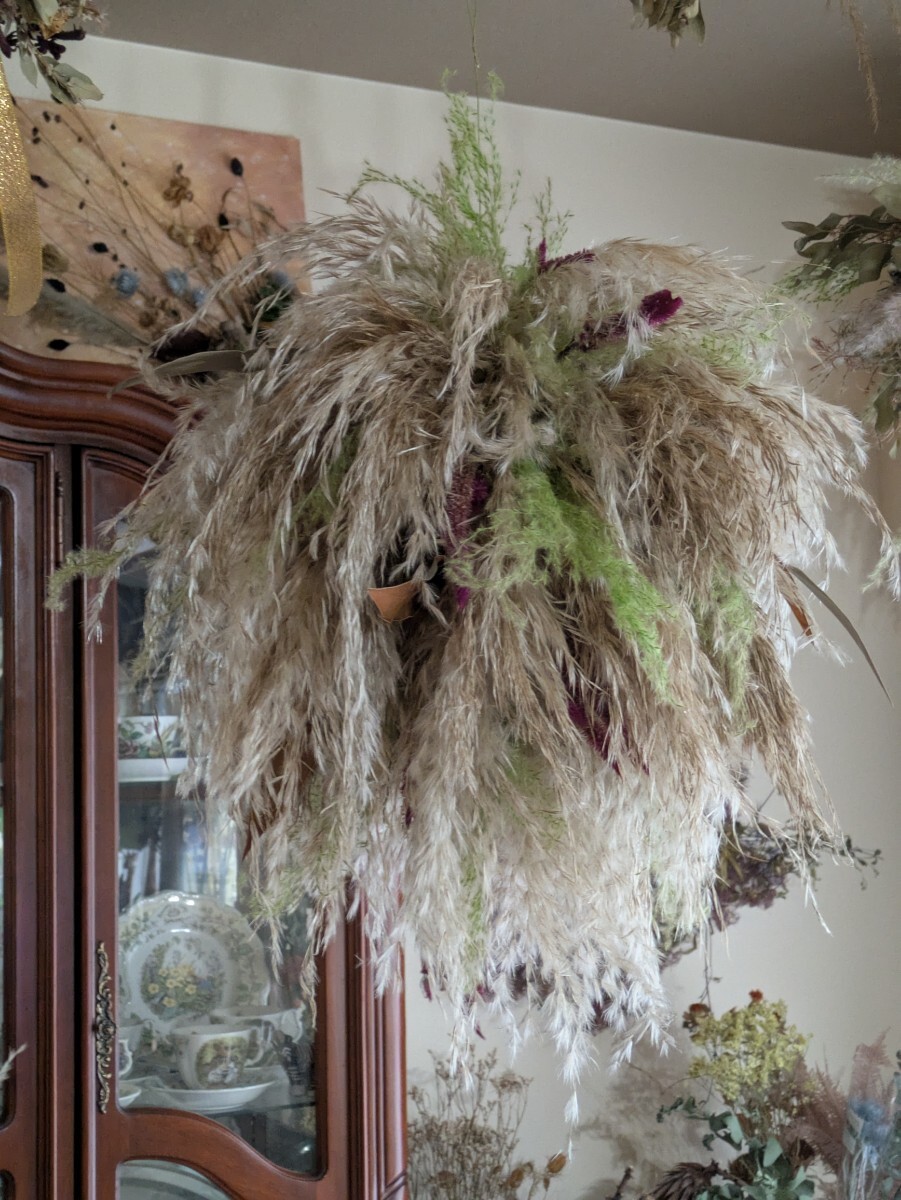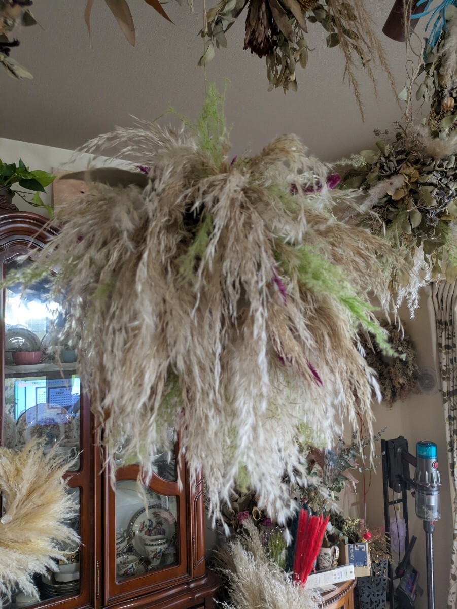 ドライフラワー★ ゆらゆら2色の大きめパンパスフライングボール★インテリア 1点物 癒し 店舗にも♪グレビレア ケイトウ