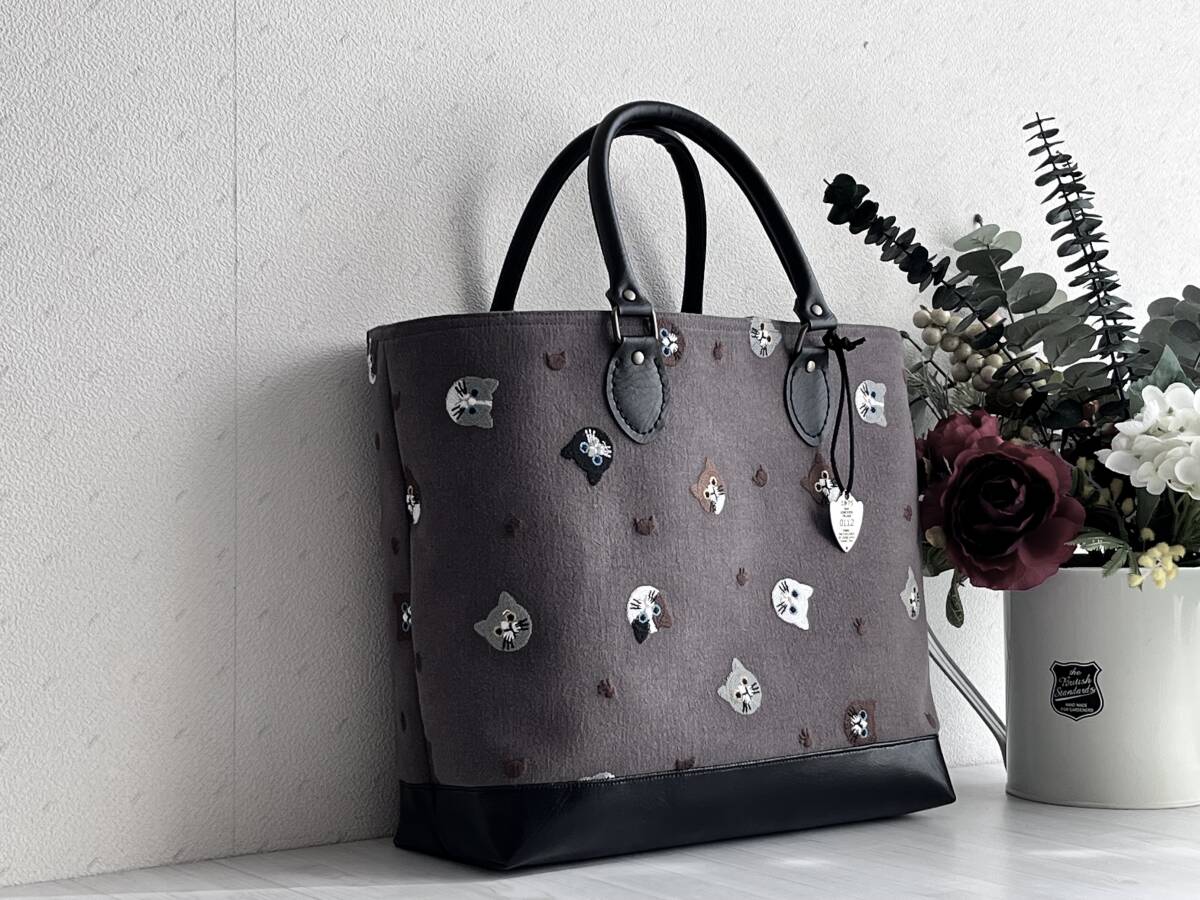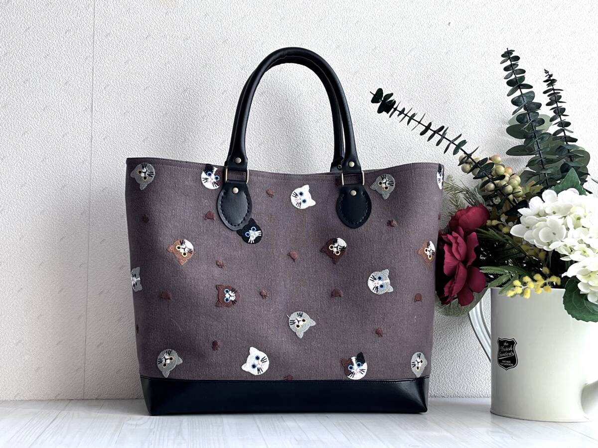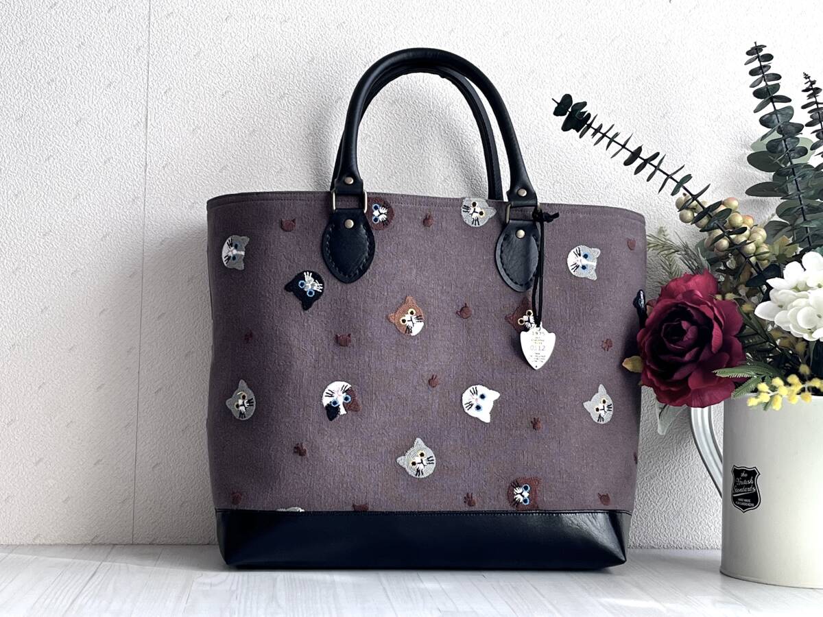 ハンドメイド+コットンリネン+手刺繍風+ネコ+ハチワレ+クロネコ+希少カラー+濃いグレー+横長+大きめ+トートバッグ +樋口愉美子