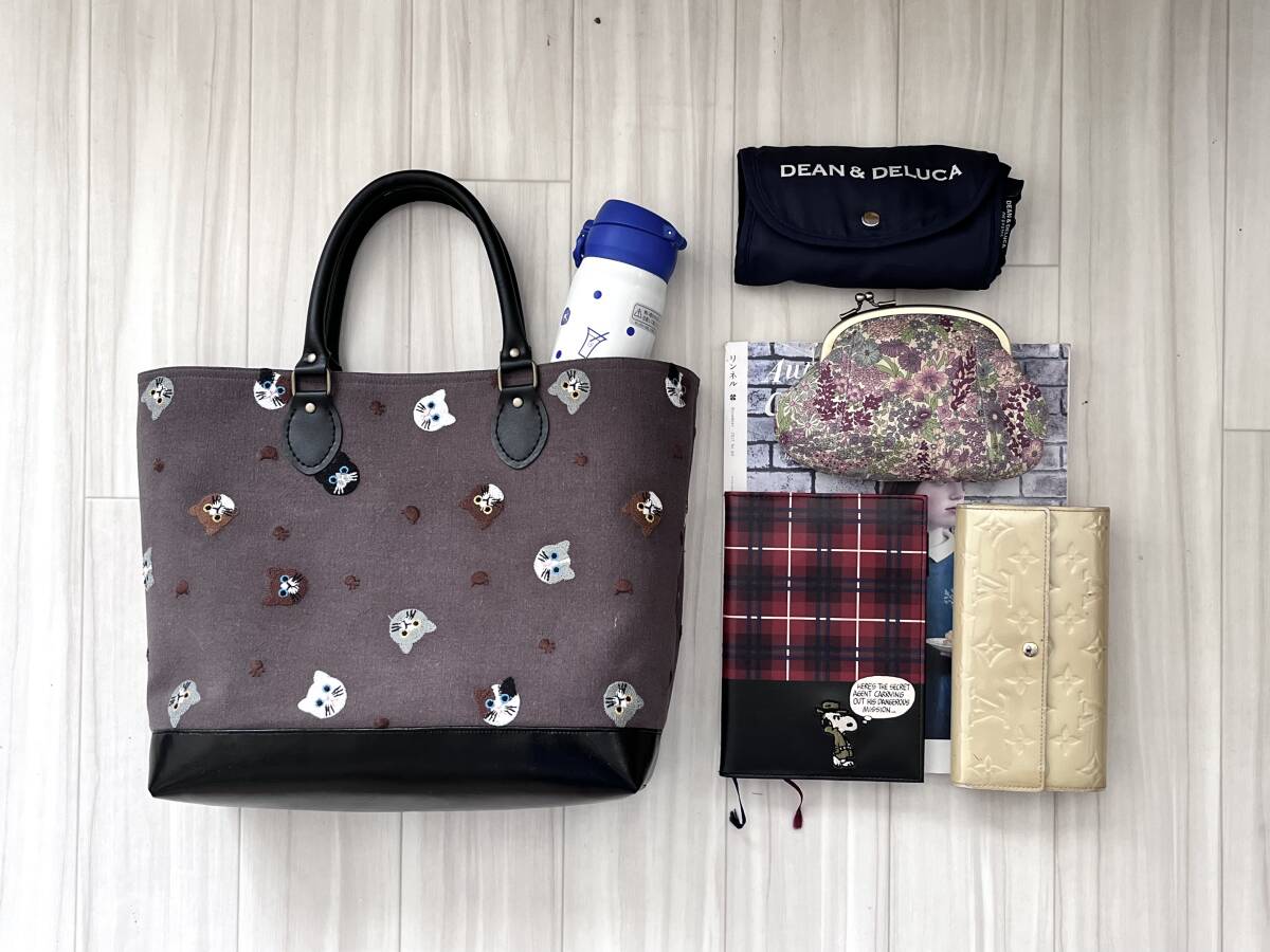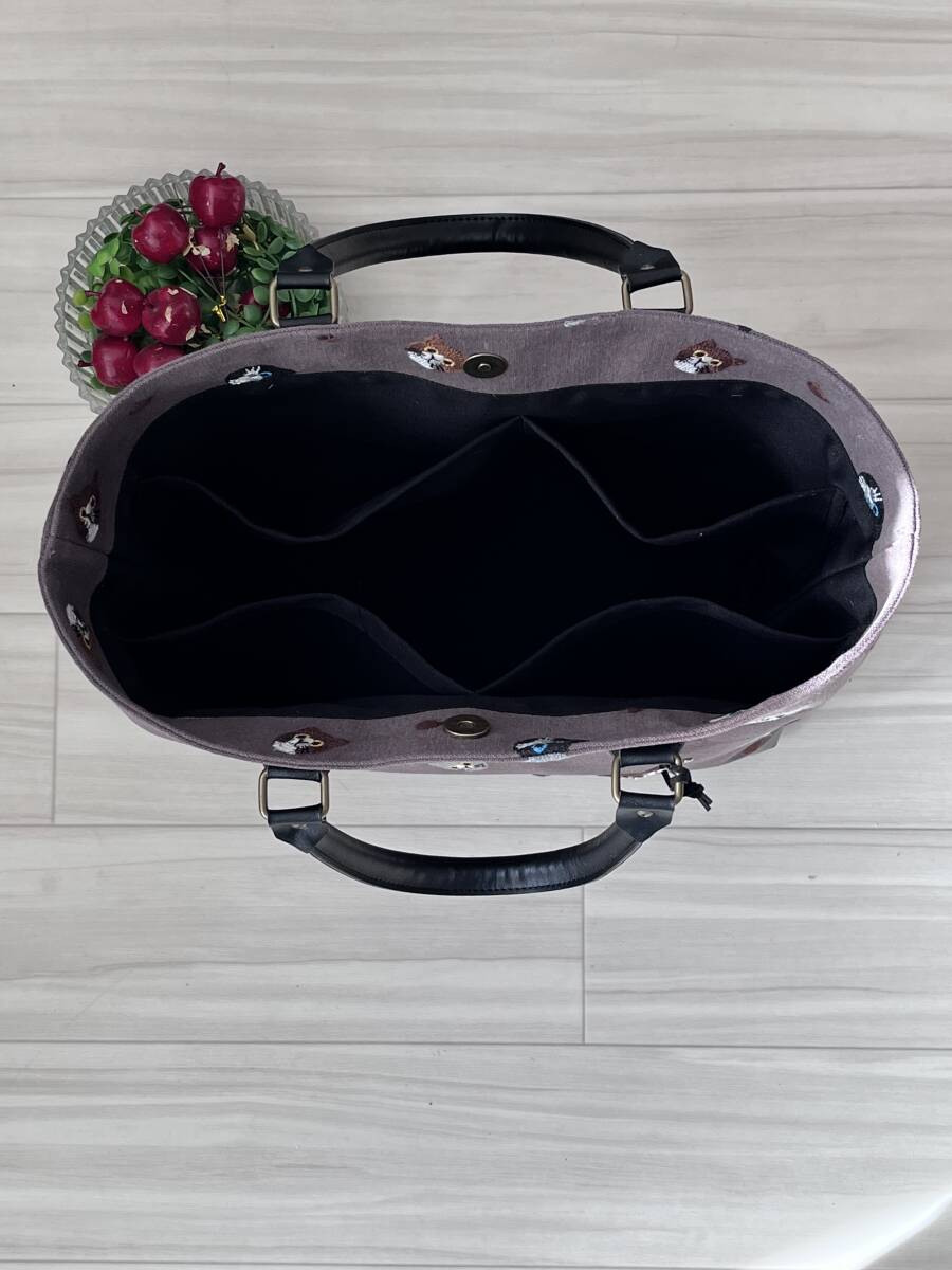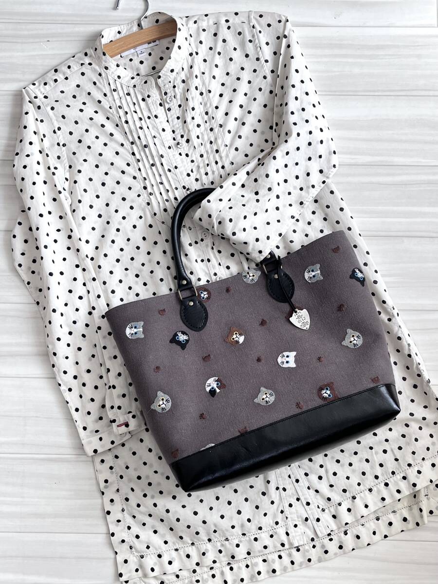 ハンドメイド+コットンリネン+手刺繍風+ネコ+ハチワレ+クロネコ+希少カラー+濃いグレー+横長+大きめ+トートバッグ +樋口愉美子