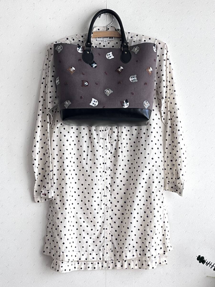 濃いめのグレー地のコットンリネンに様々なネコの刺繍が施された生地(濃いグレー)を使った