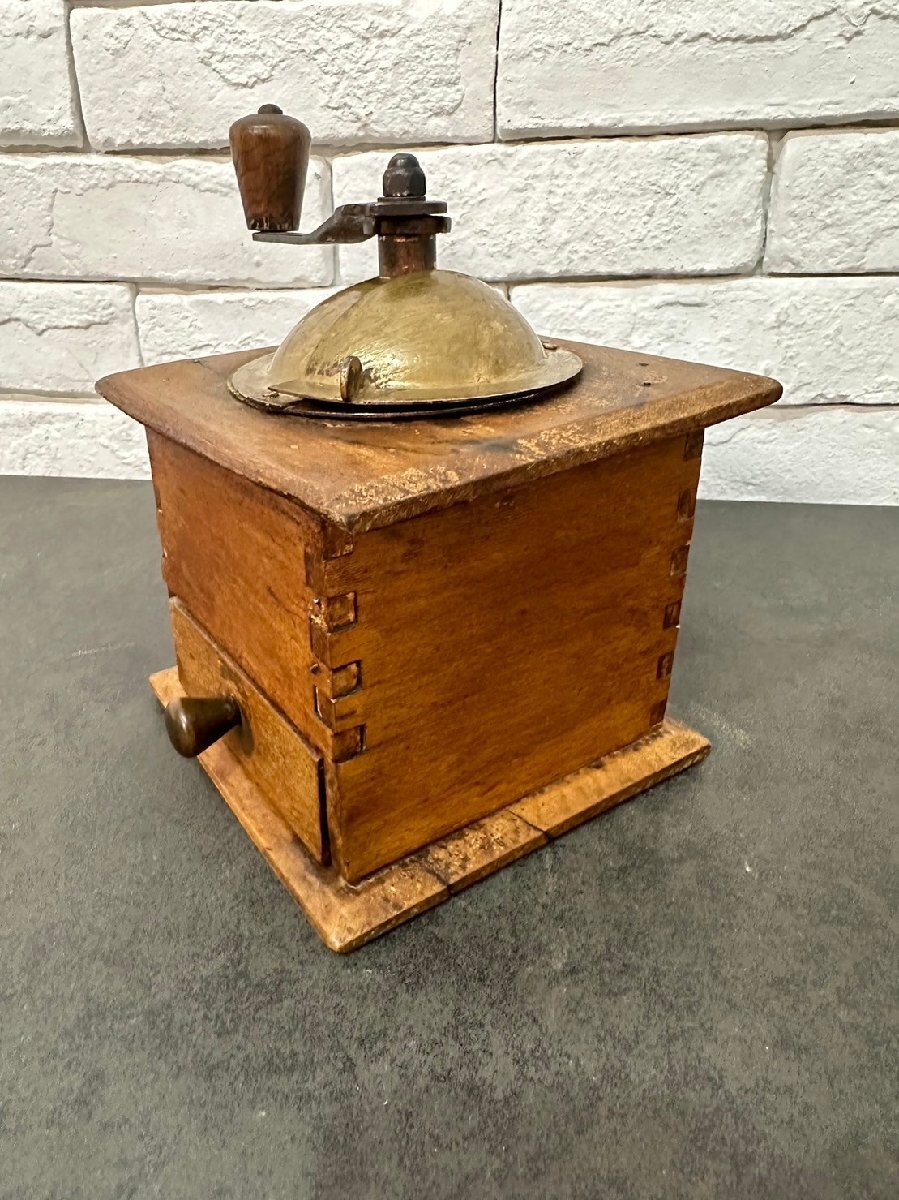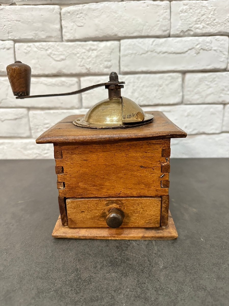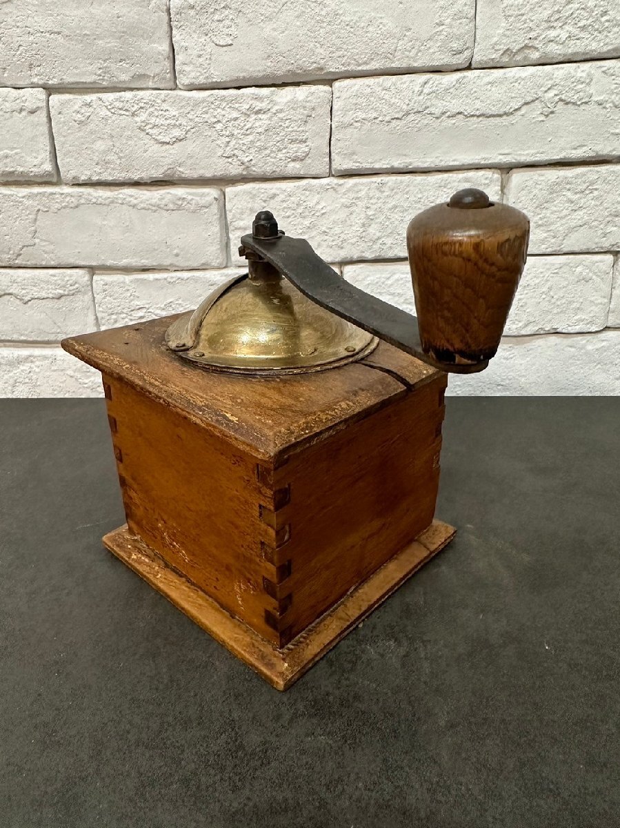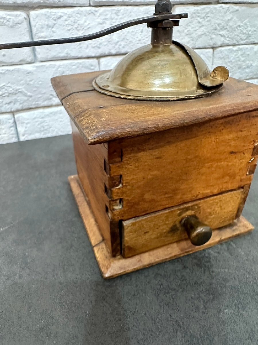 ナチュラルブラウンカラーの本体と、ブラック系とゴールドカラーの金具が付属したコーヒーミルです。