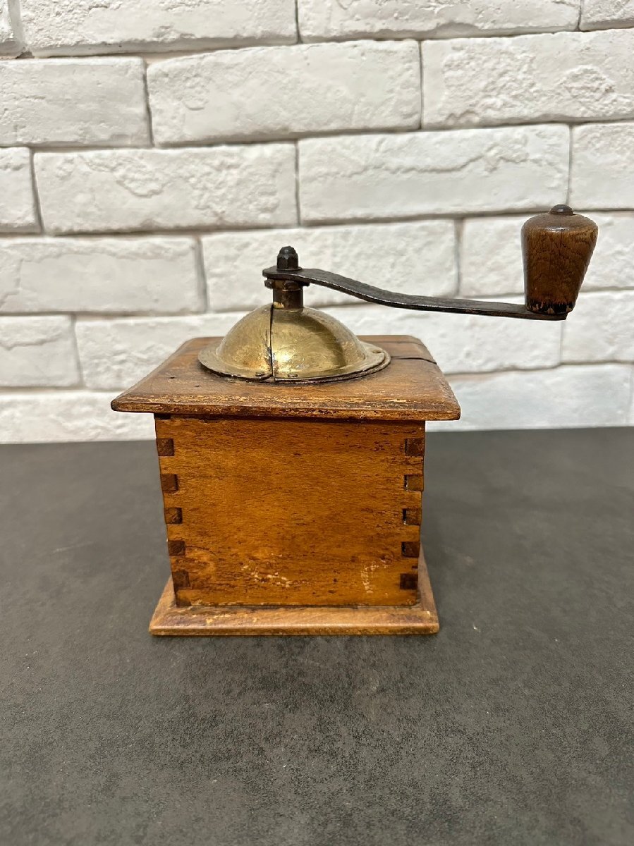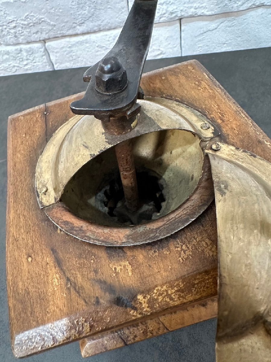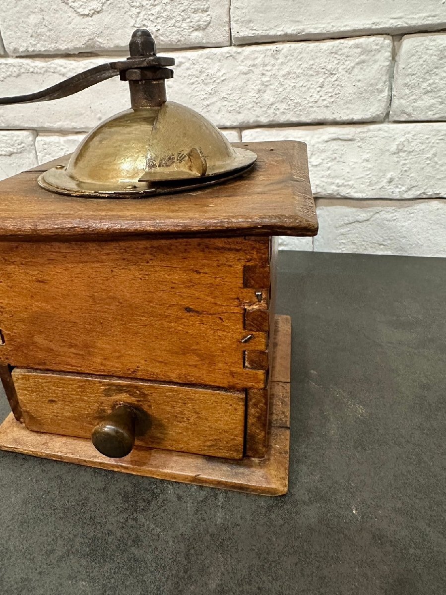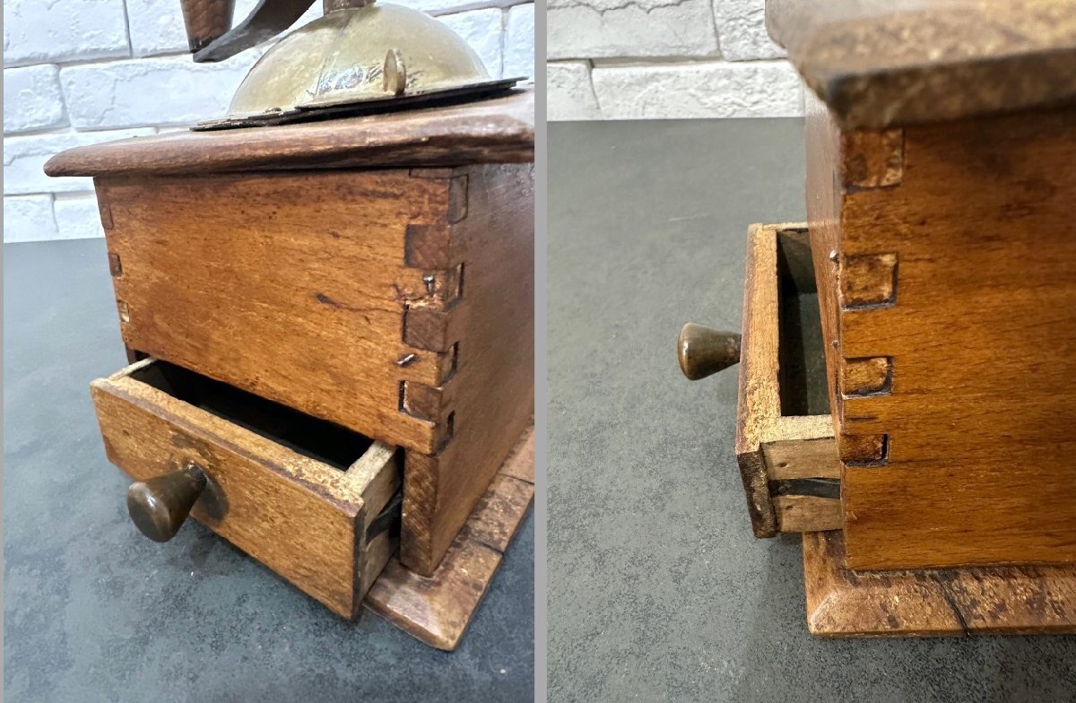 ナチュラルブラウンカラーの本体と、ブラック系とゴールドカラーの金具が付属したコーヒーミルです。